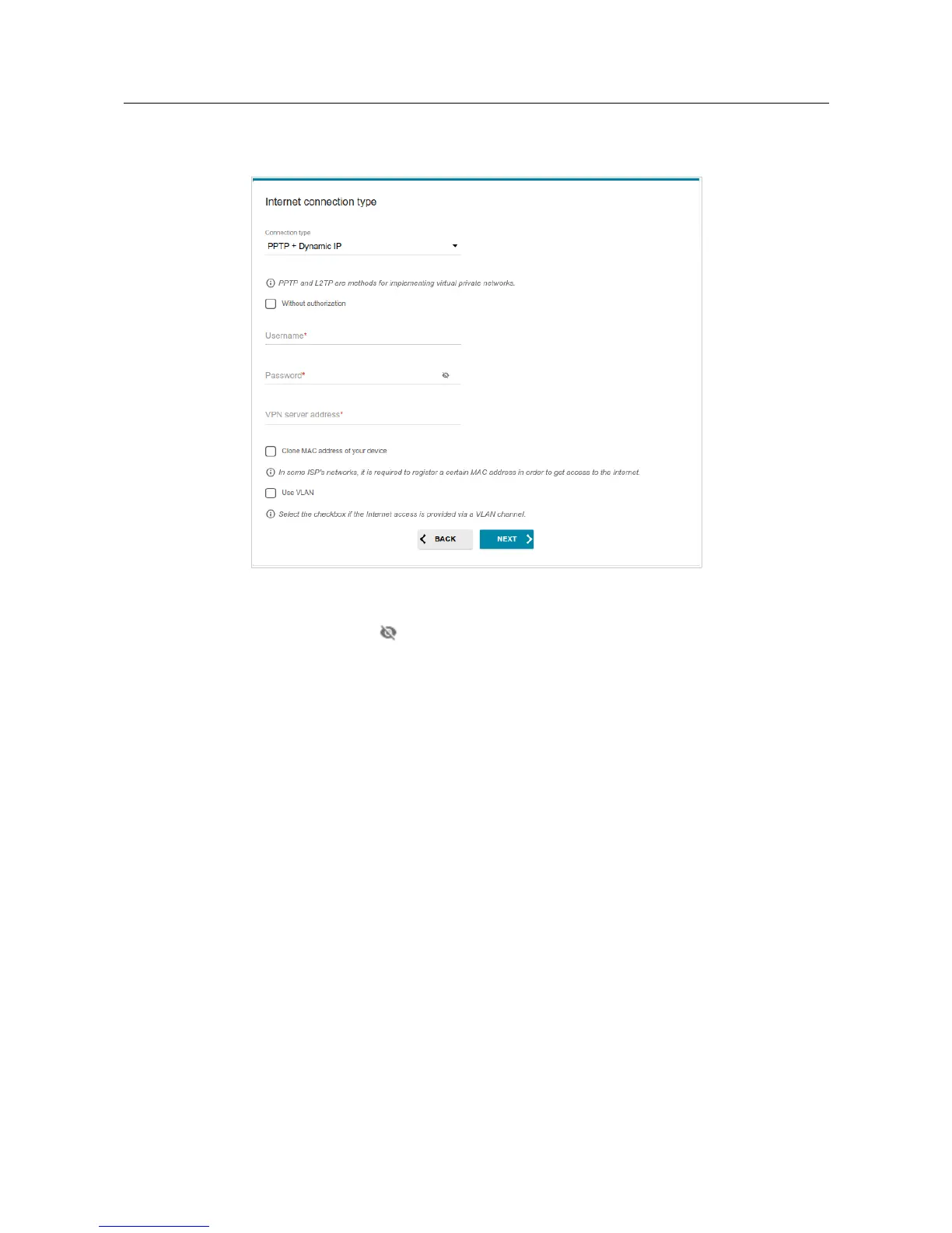 your ISP. Click the Show icon ( ) to display the entered password. If authorization is not