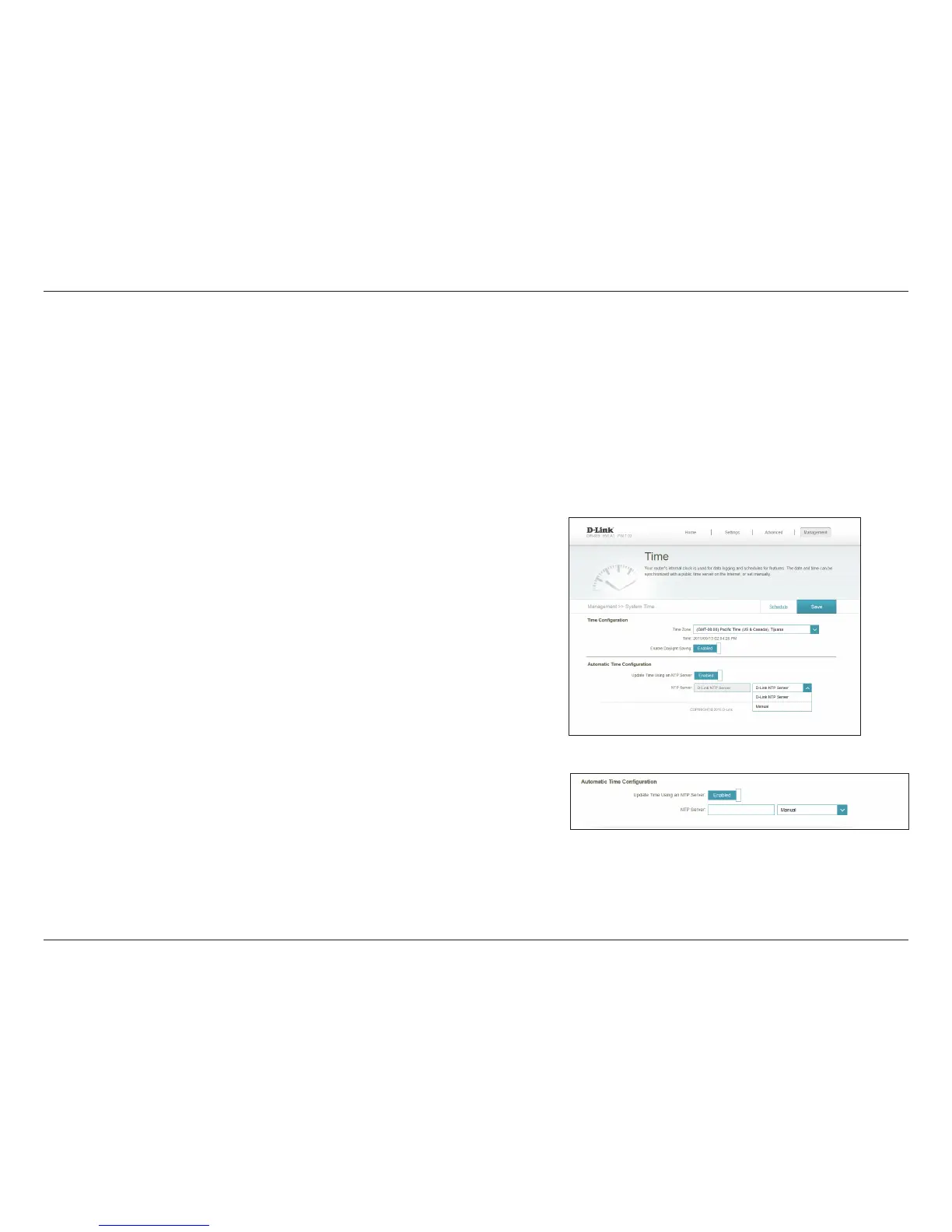 The Time page allows you to congure, update, and maintain the correct time on the DIR-859's internal system clock. The router's internal clock is