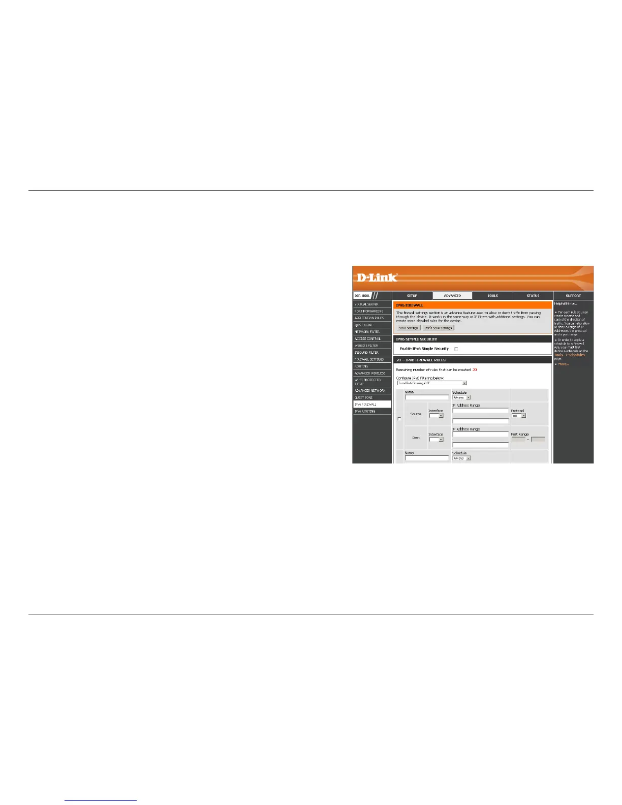 The DIR-860L’s IPv6 Firewall feature allows you to congure which kind of IPv6 trac is allowed to pass through the device.