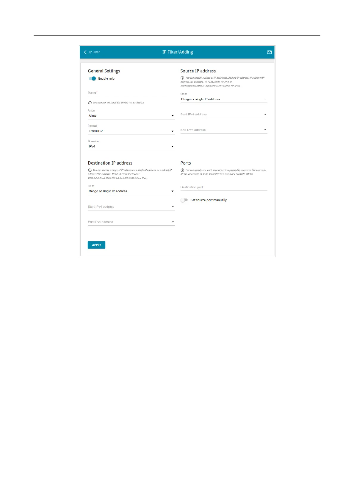 Figure 123. The page for adding a rule for IP filtering.