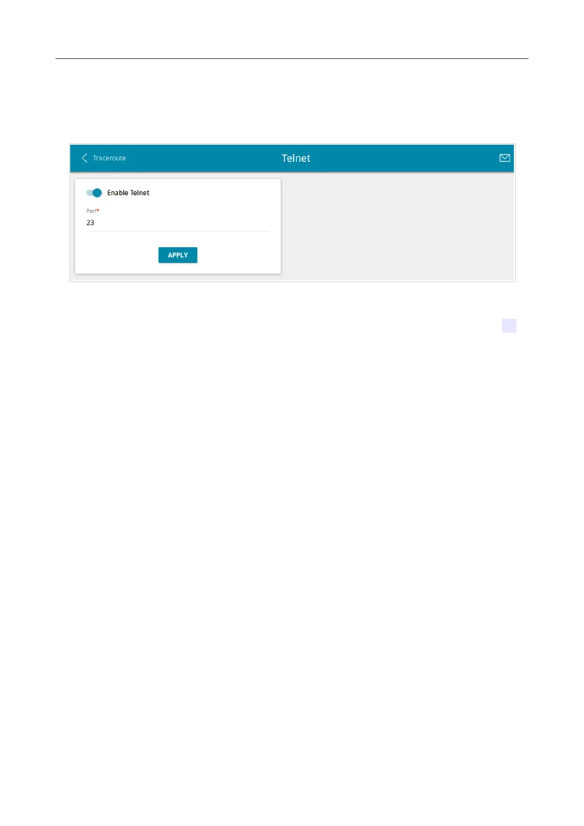 To enable access via TELNET, move the Enable Telnet switch to the right. In the Port field, enter
