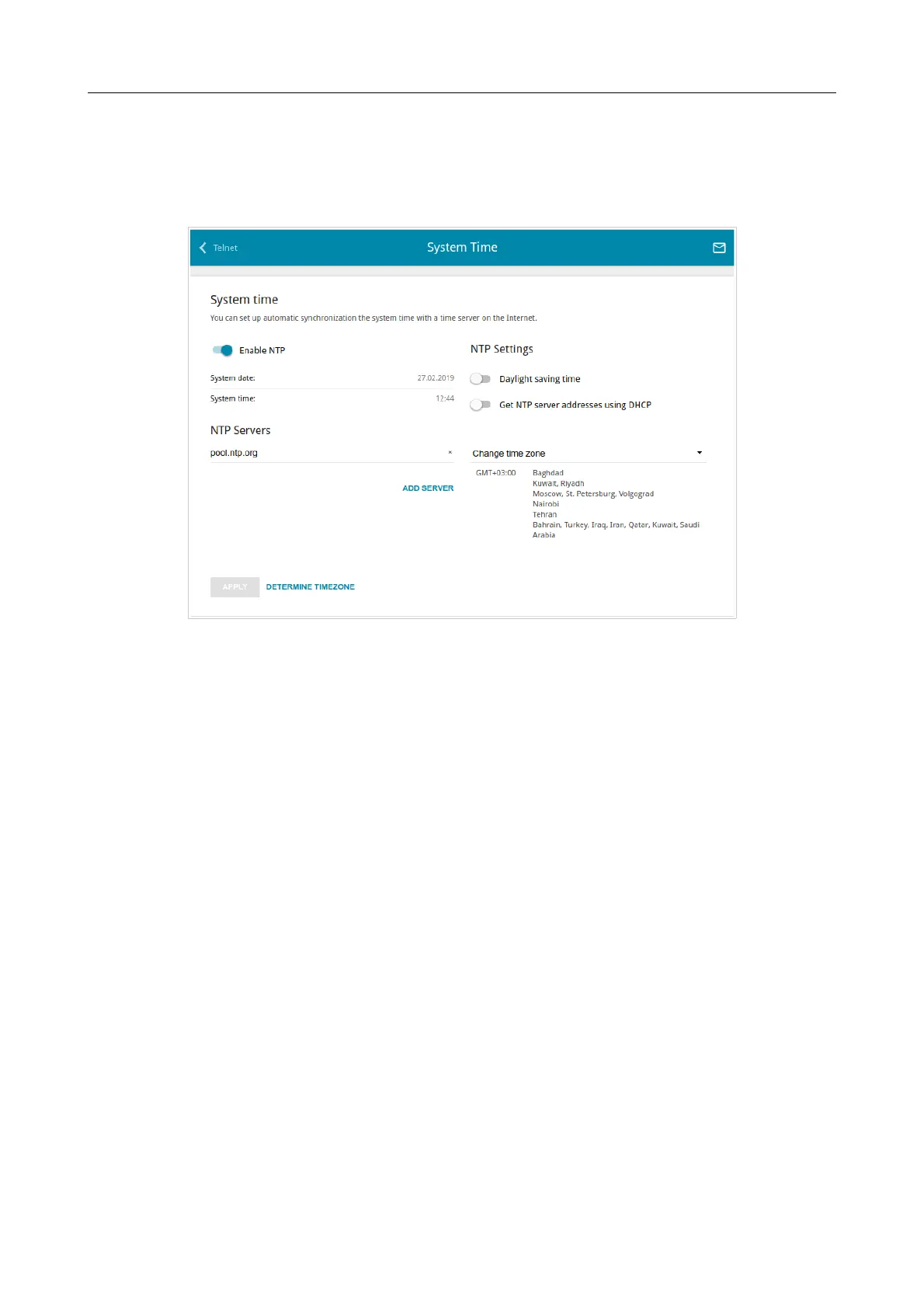 time switch to the right in the NTP Settings section and click the APPLY button.