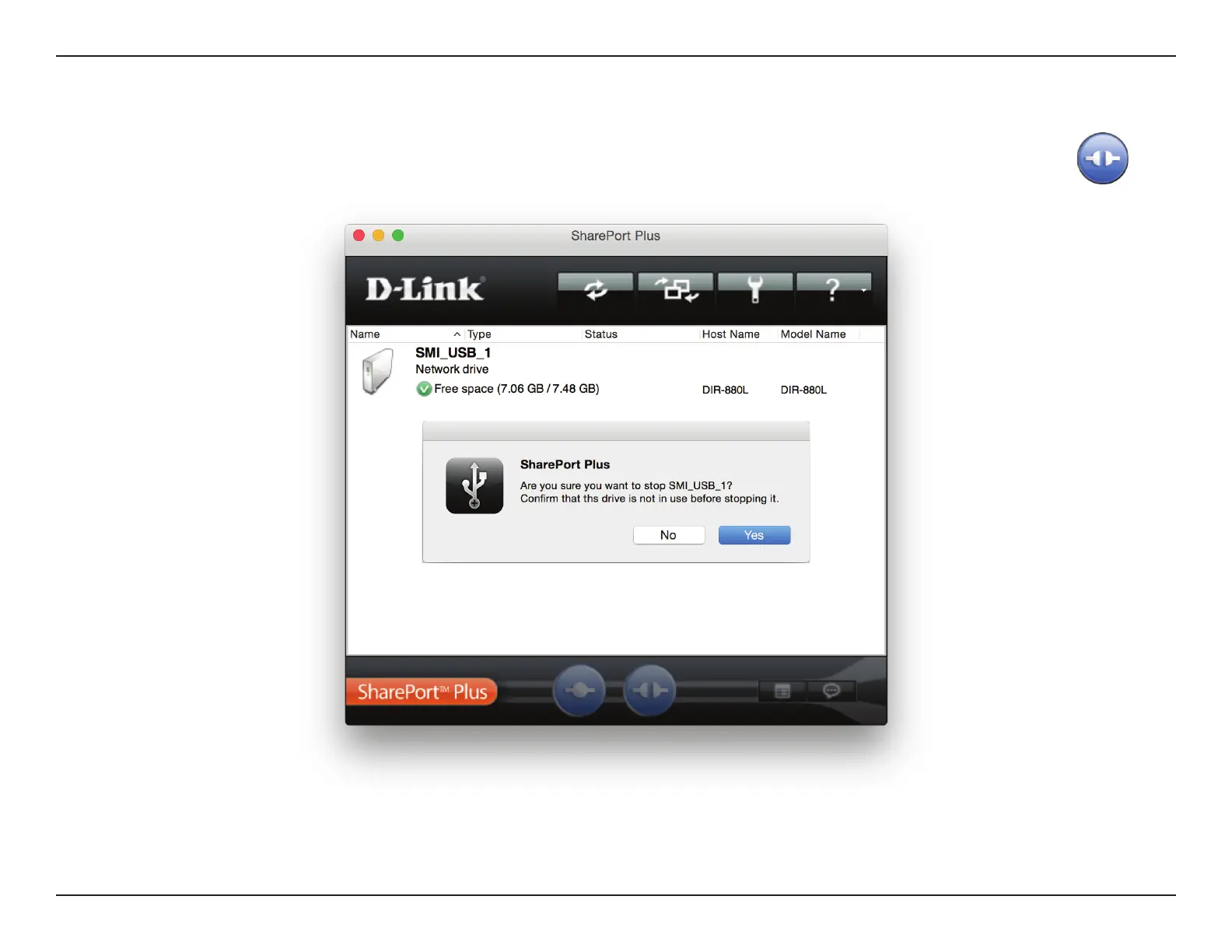 Click yes to conrm you wish to stop using the device. You may then physically disconnect your USB storage device from your D-Link SharePort