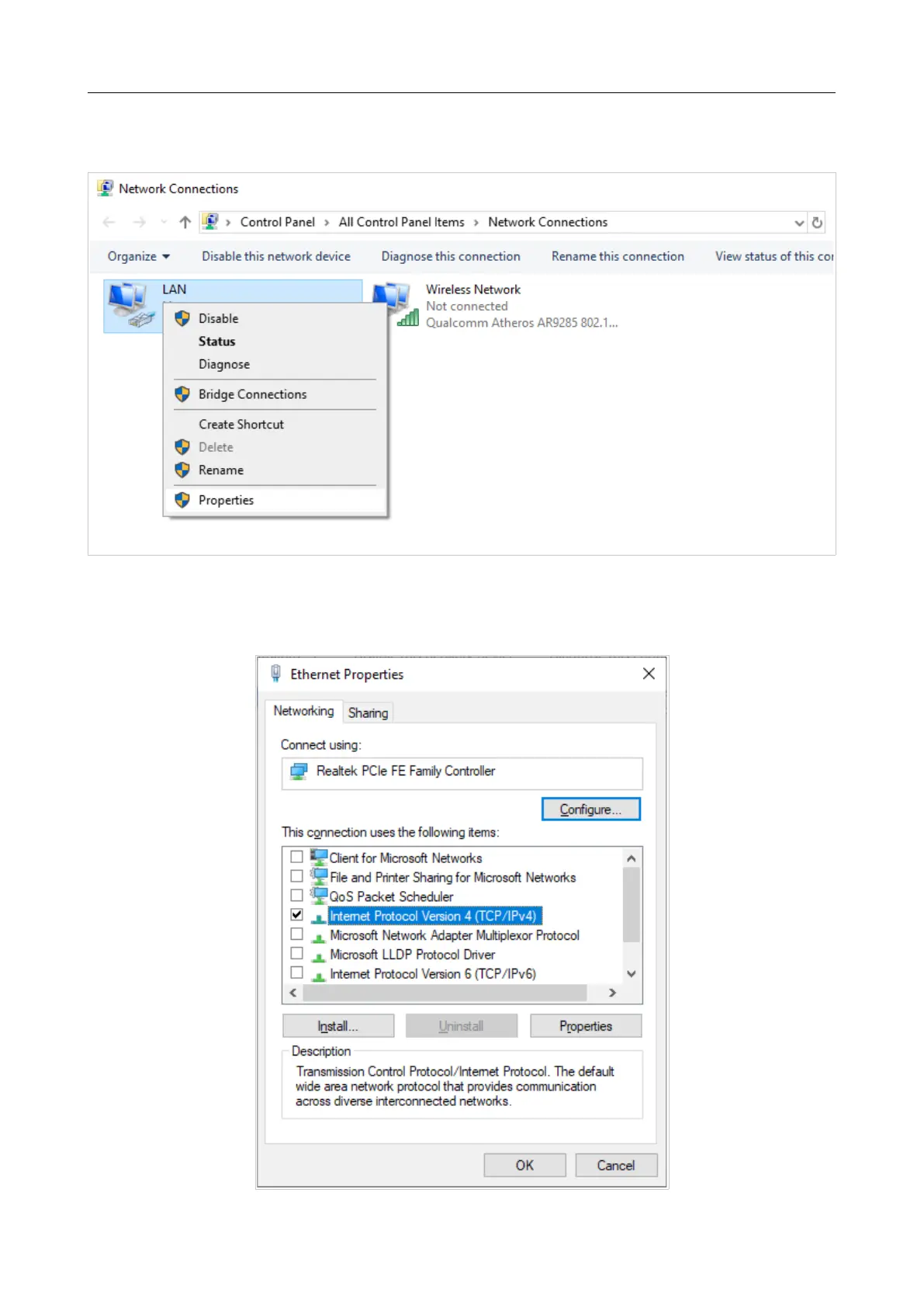 4. In the opened window, right-click the relevant Local Area Connection icon and select