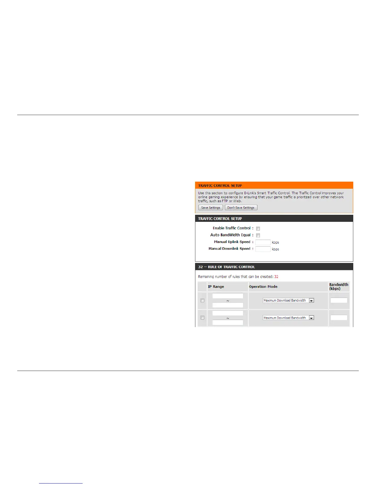 Use this section to congure D-Link’s Smart Trafc Control. The Trafc Control improves your online gaming experience