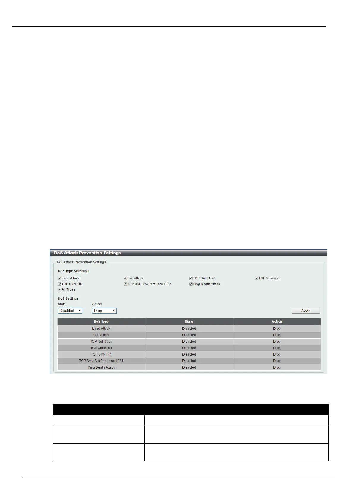 This window is used to view and configure the Denial-of-Service (DoS) attack prevention settings. The