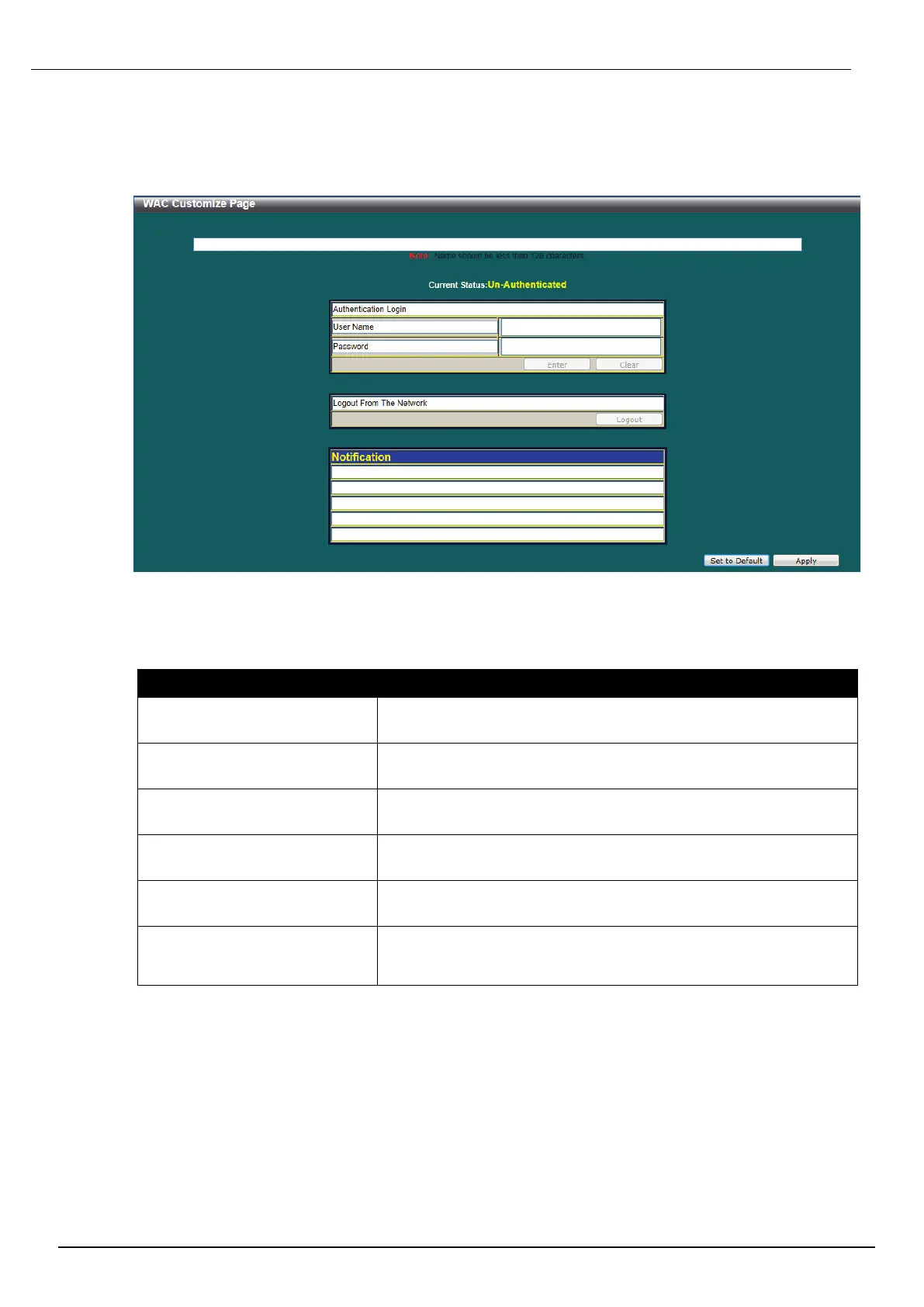 To view the following window, click Security > Web-based Access Control > WAC Customize Page, as