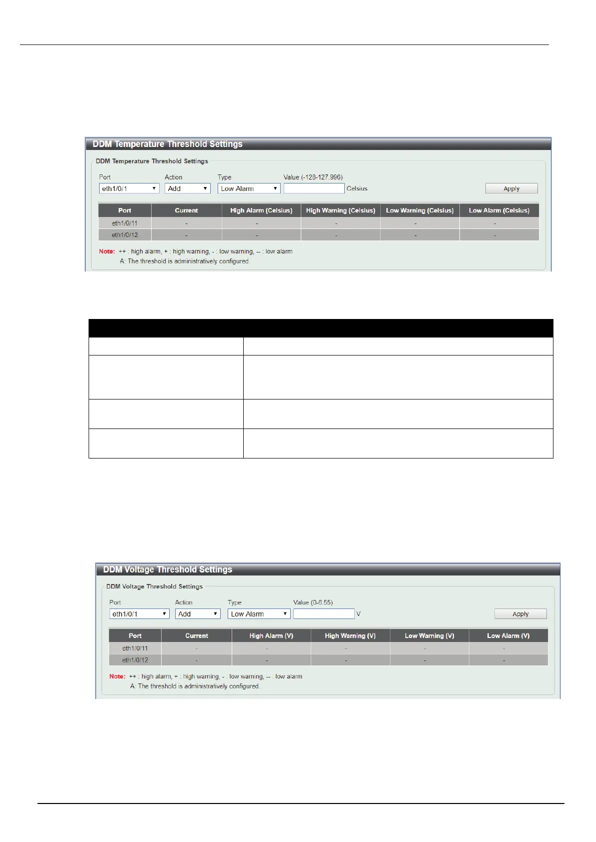This window is used to configure the DDM Voltage Threshold Settings for specific ports on the Switch.