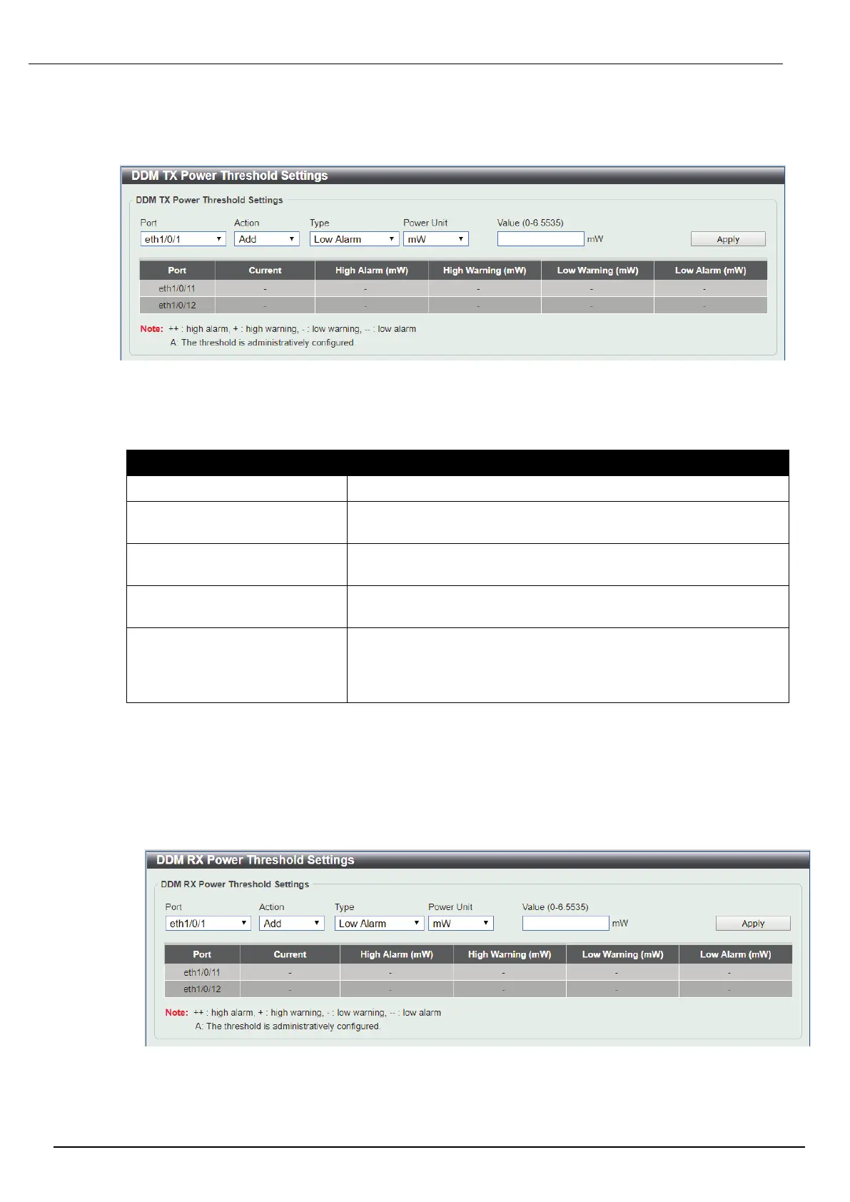 Click the Apply button to accept the changes madeDDM RX Power Threshold Settings