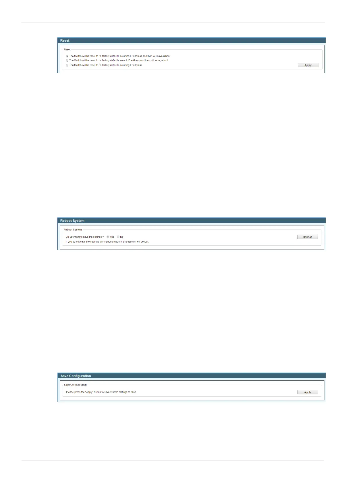 reboot option to reset the Switch’s configuration to its factory default settings. This option will exclude the