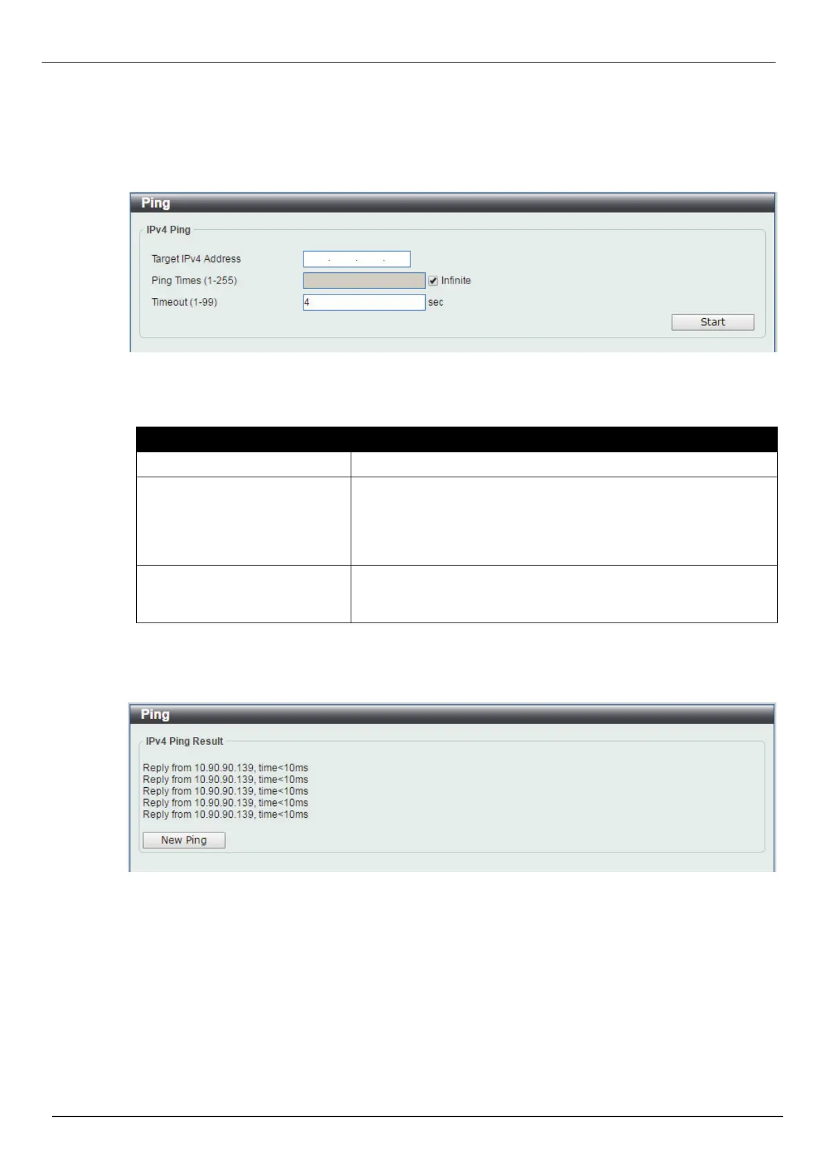 After clicking the Start button in IPv4 Ping section, the following IPv4 Ping Result section will appear: