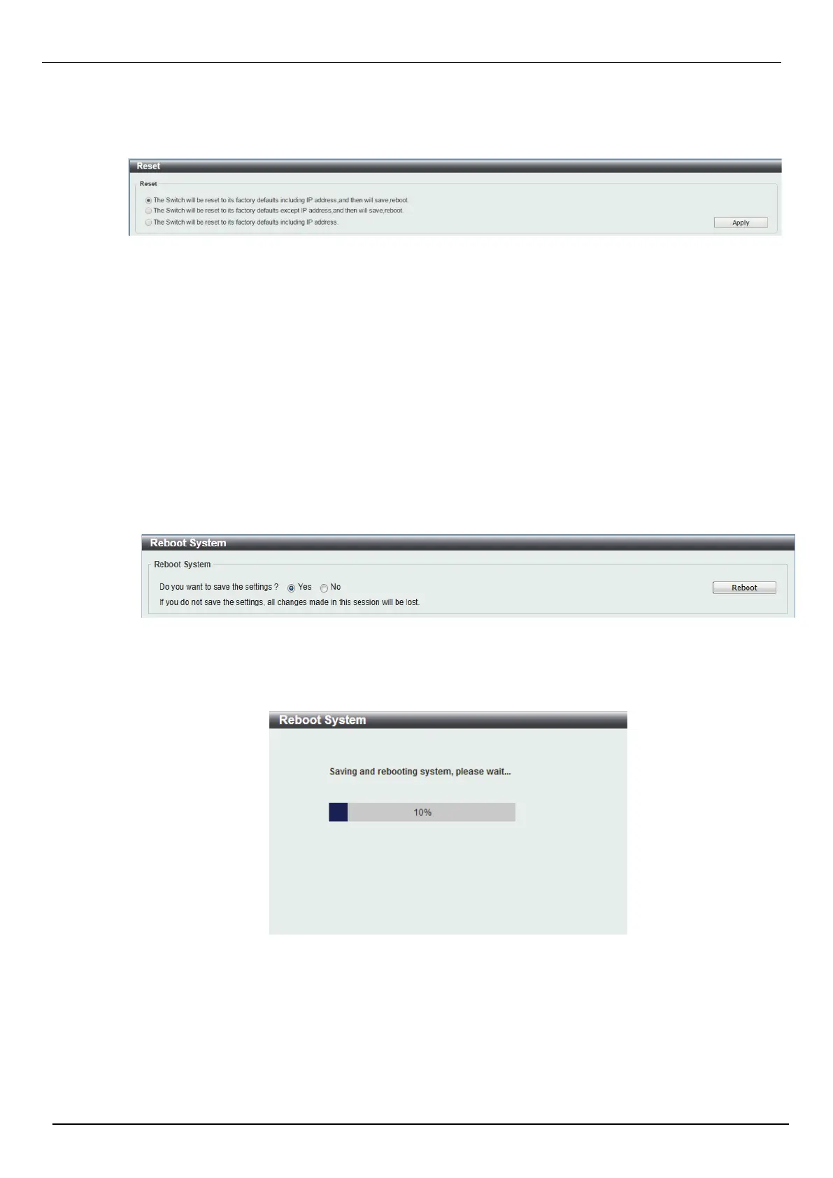 reboot option to reset the Switch’s configuration to its factory default settings. This option will exclude the