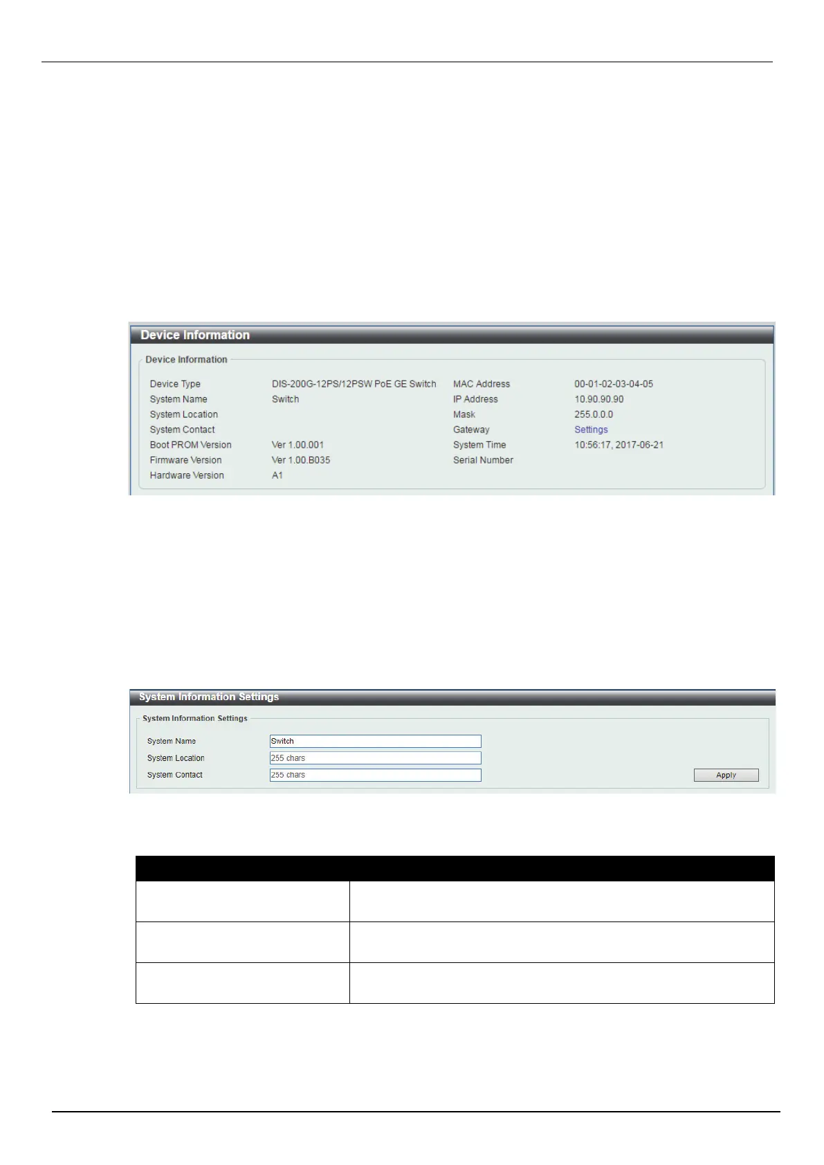 The user can enter a System Name, System Location, and System Contact to aid in defining the Switch.