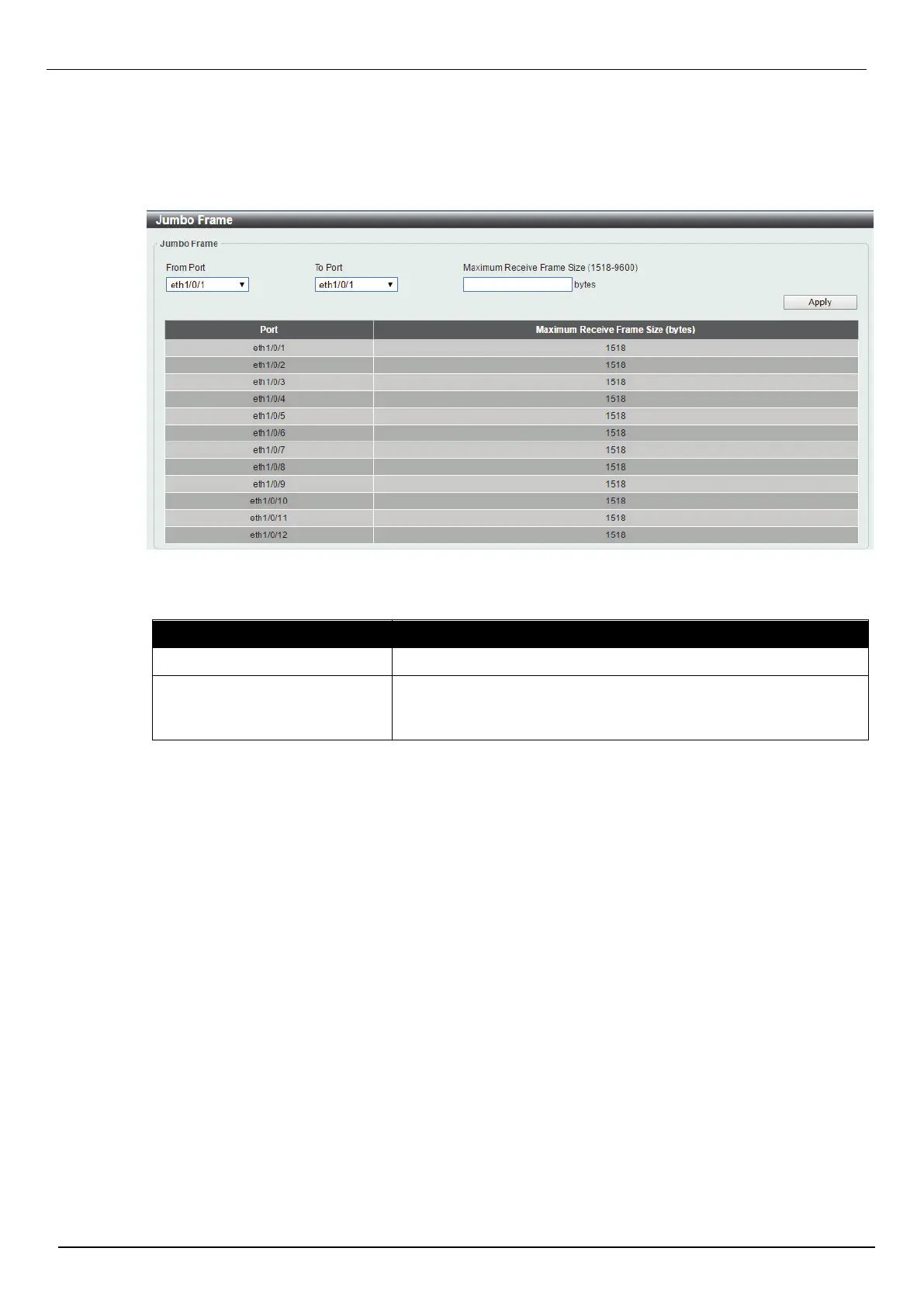This window is used to view and configure the Jumbo Frame size and settings. The Switch supports