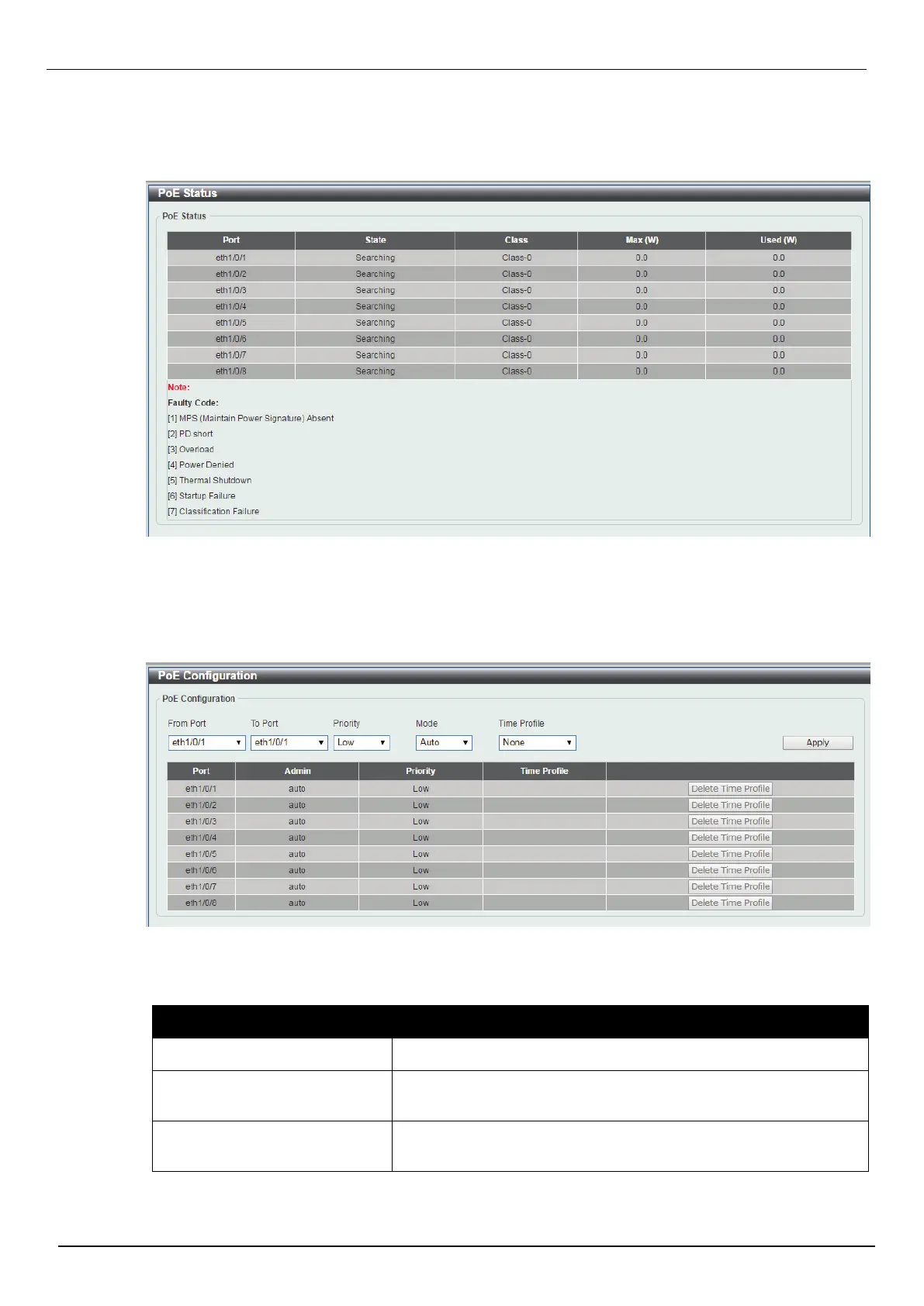 This window is used to configure the description, and display the PoE status of each port.