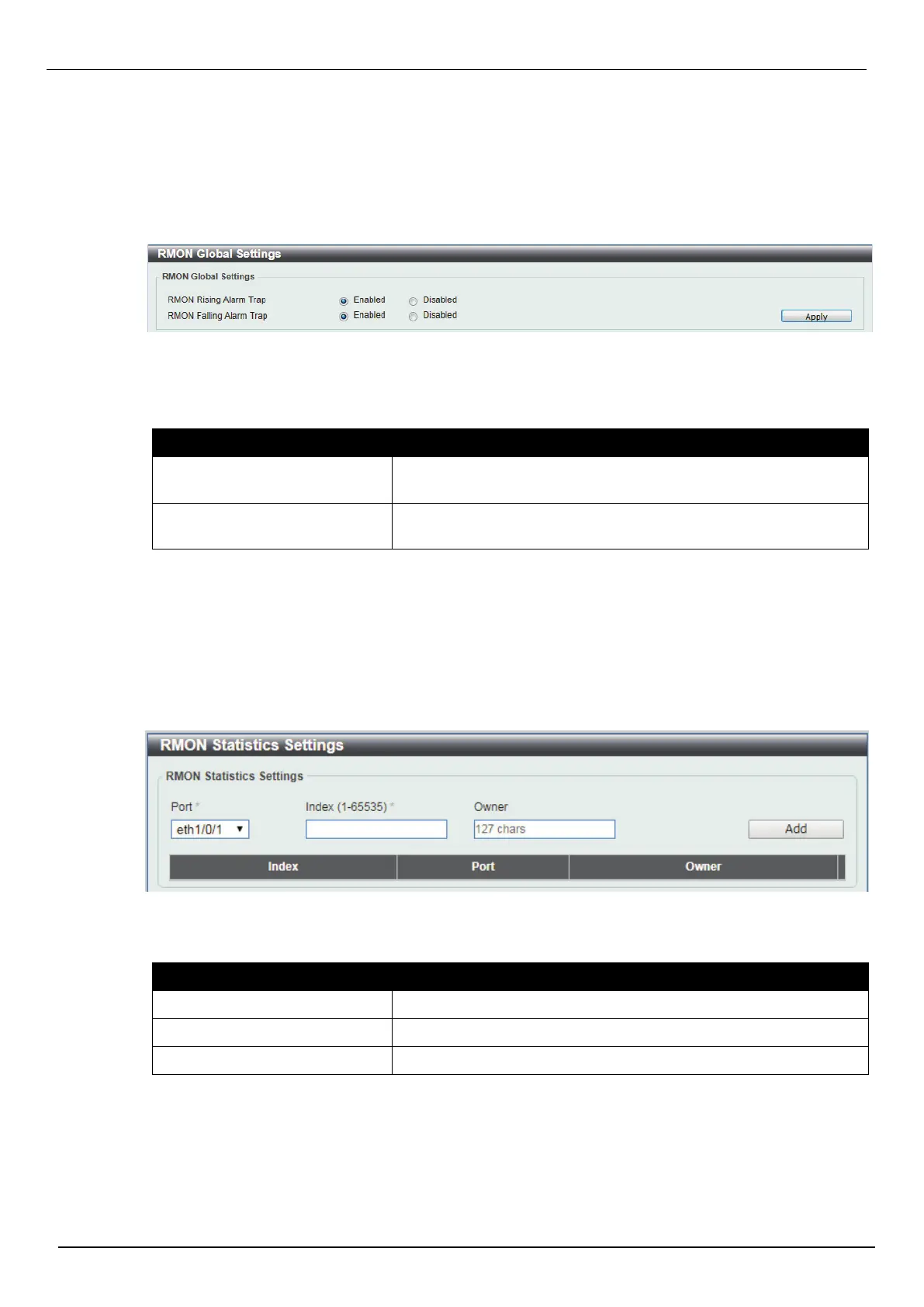 To view the following window, click Management > RMON > RMON Statistics Settings, as shown