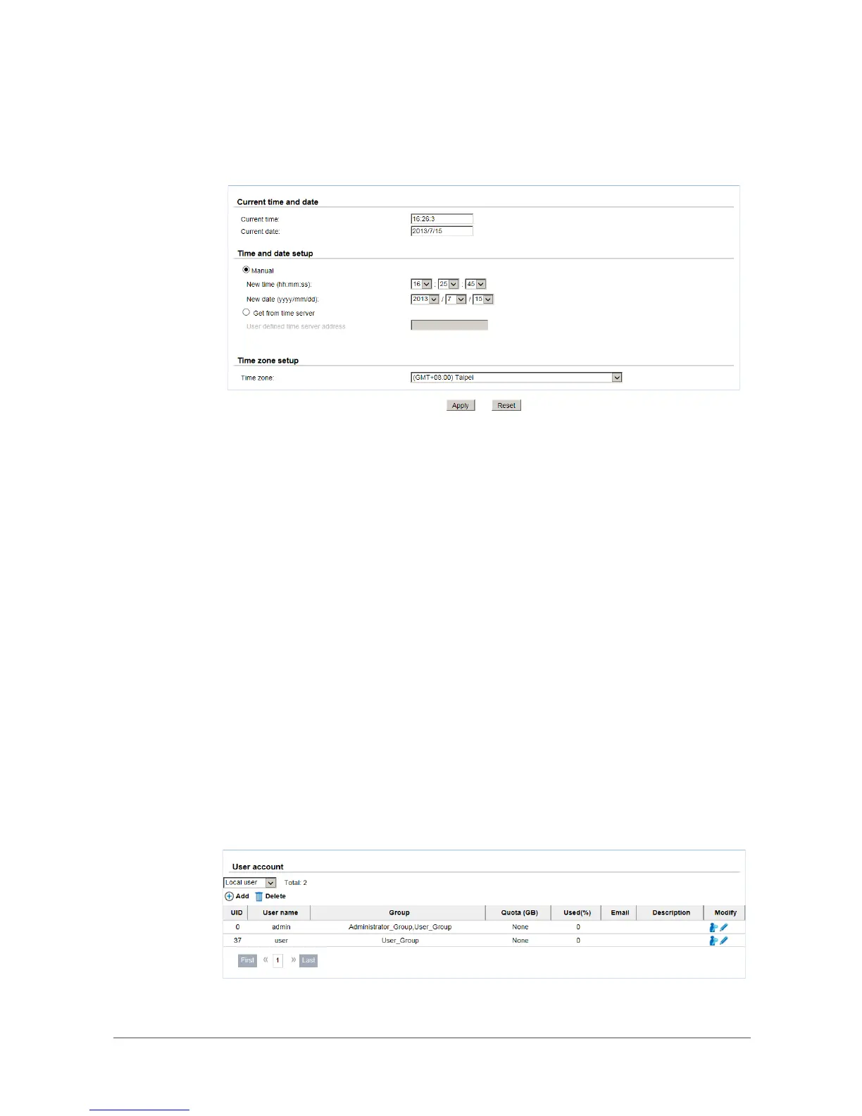Time and Date Setup: Changes the current date, time or time server. Enter the IP address to