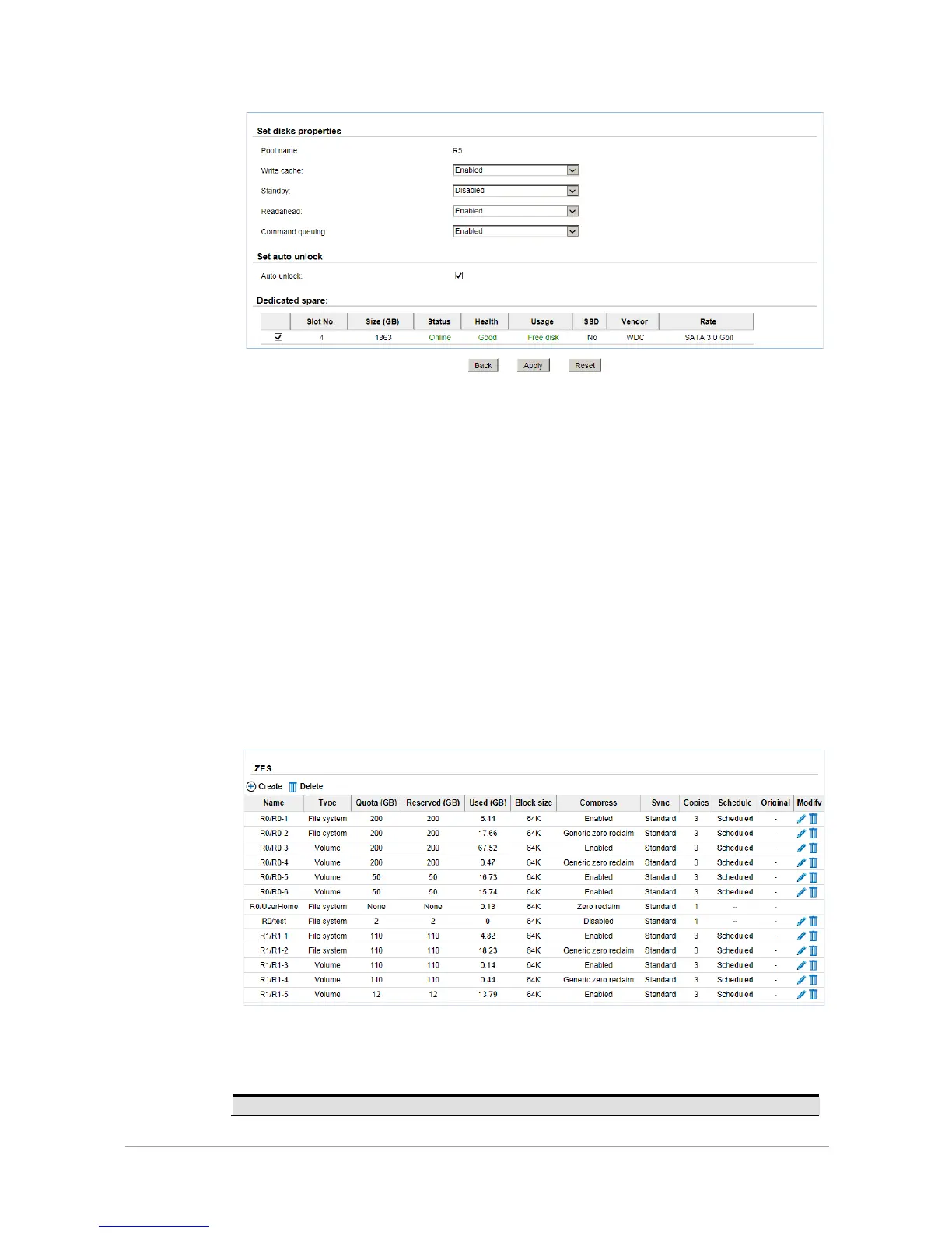 The ZFS option provides functions to manage ZFS datasets such as create, edit, delete, take