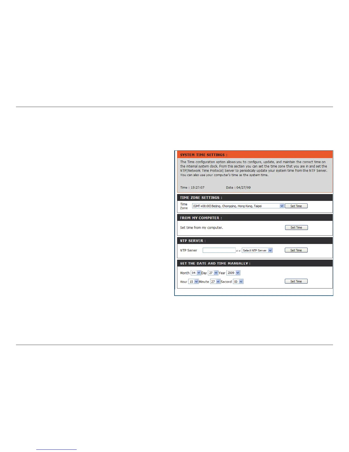 The DNS-313 Time and Date page contains several different options for setting the device’s internal clock. It is important