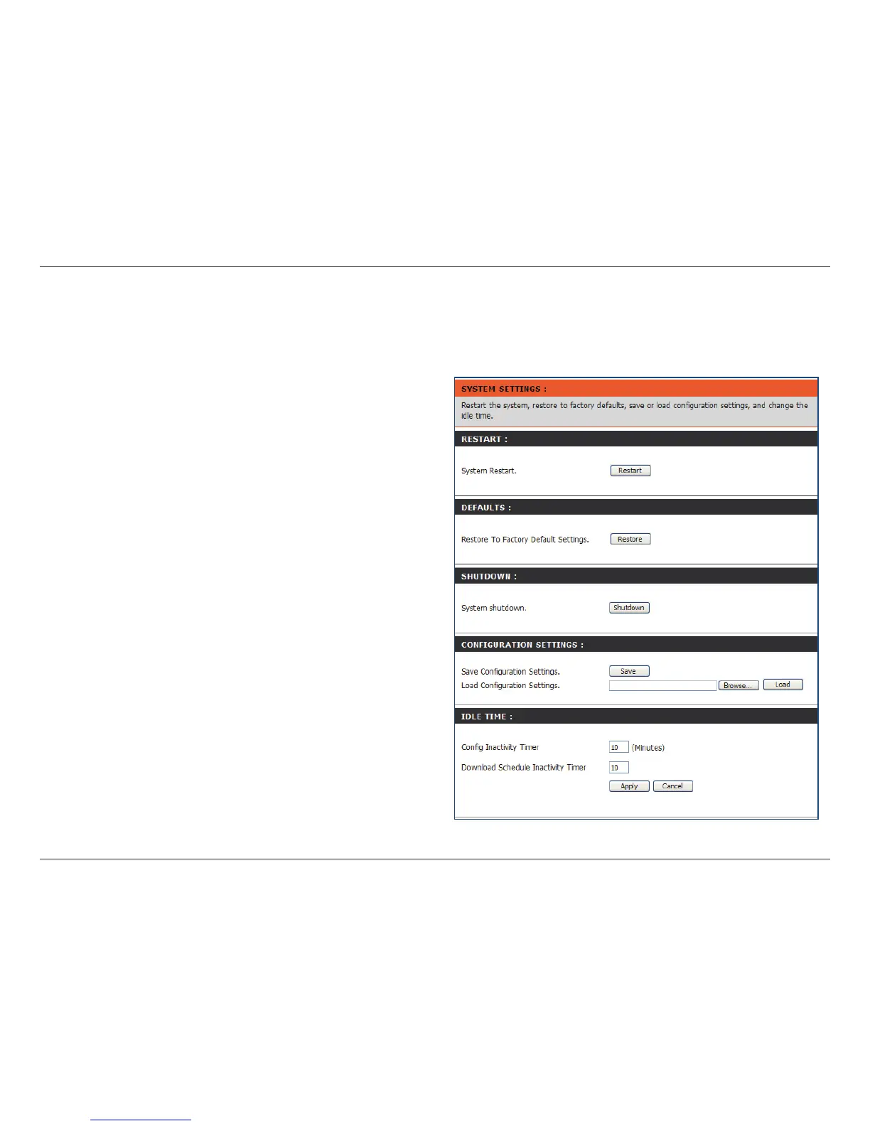 The DNS-313 System menu provides options for system restarts, saving and loading conguration settings, and setting