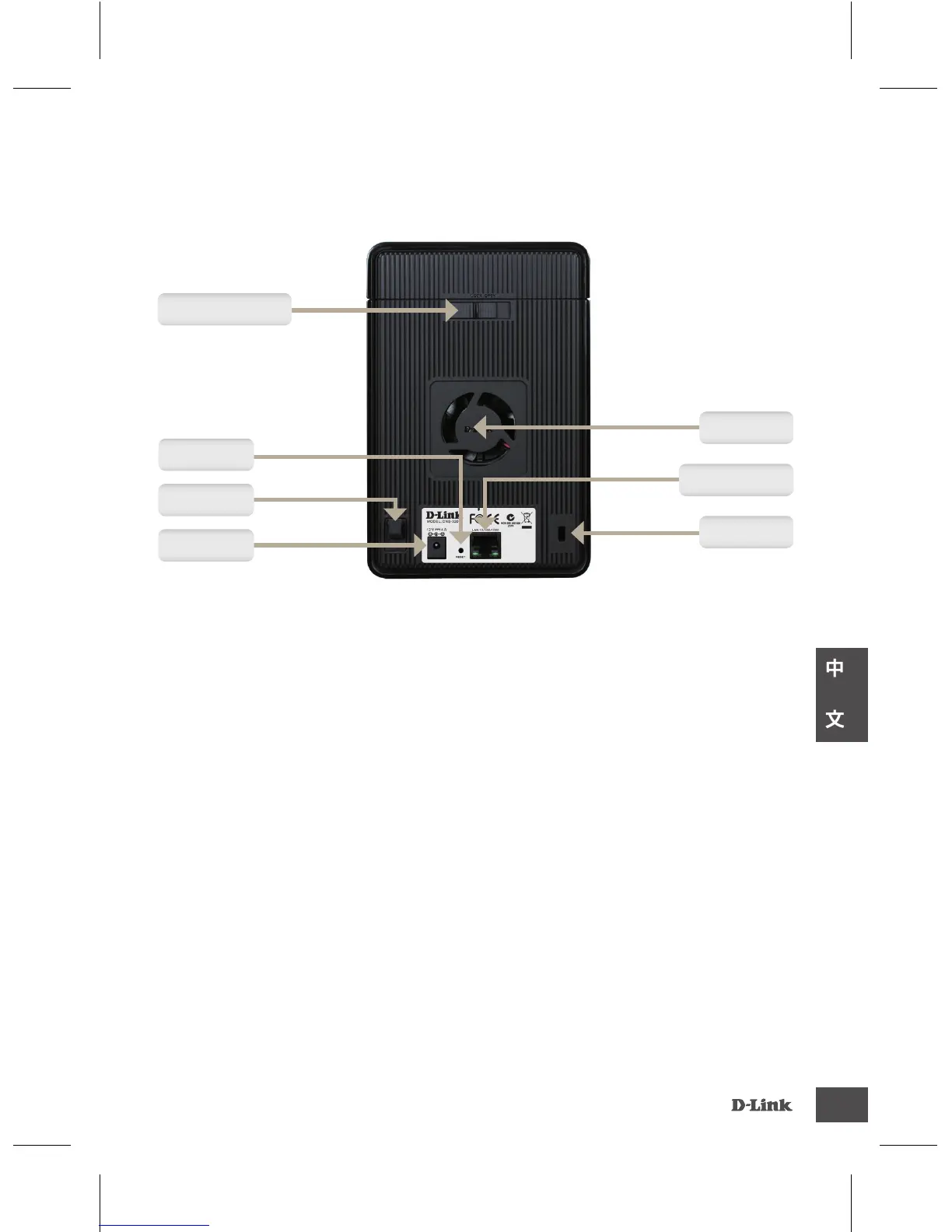 本按鈕位於DNS-320背面網路孔旁邊,按下重置按鈕10秒後,裝置設定值將被回復出廠預