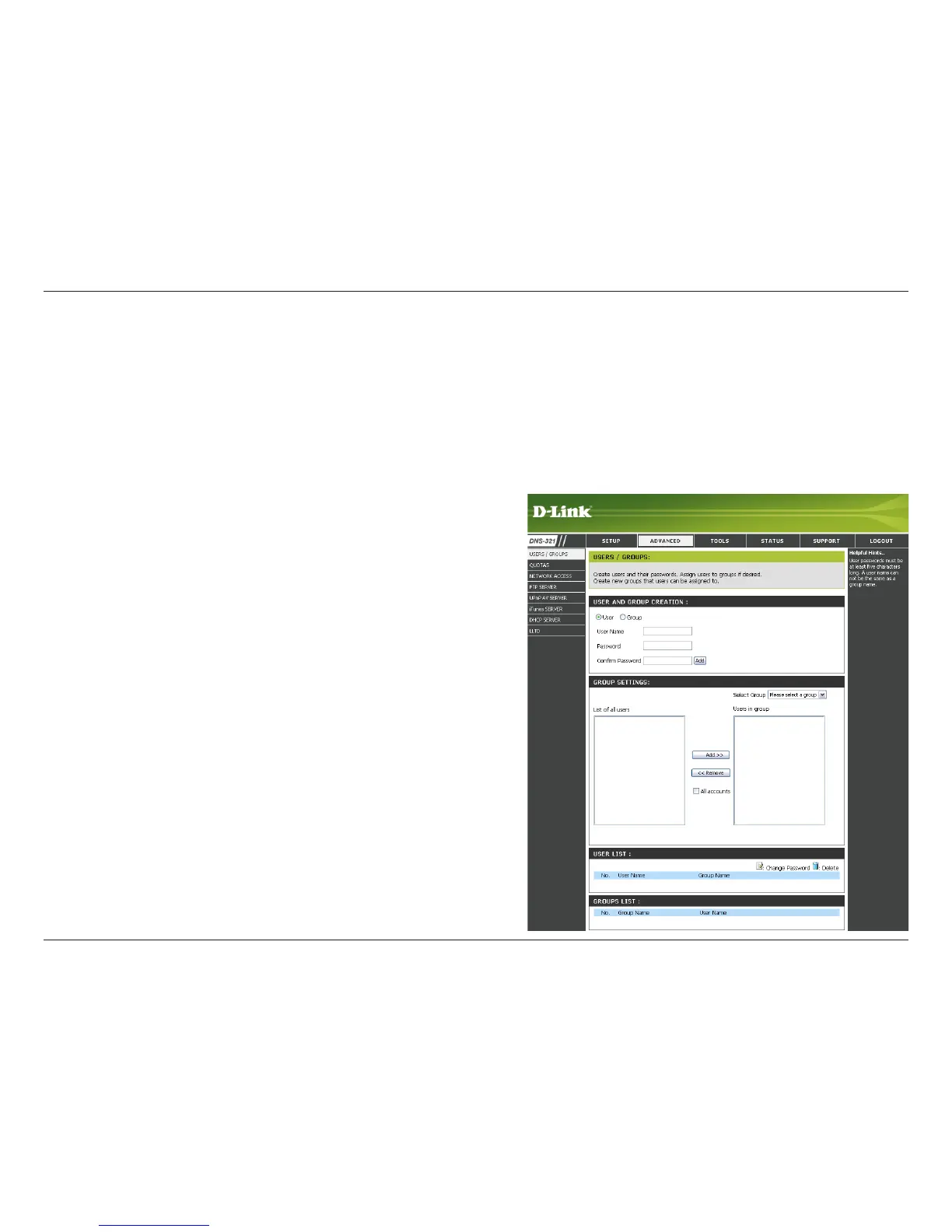 The Users/Groups menu is used to create and manage user and group accounts. Up to 64 users and 10 groups can be