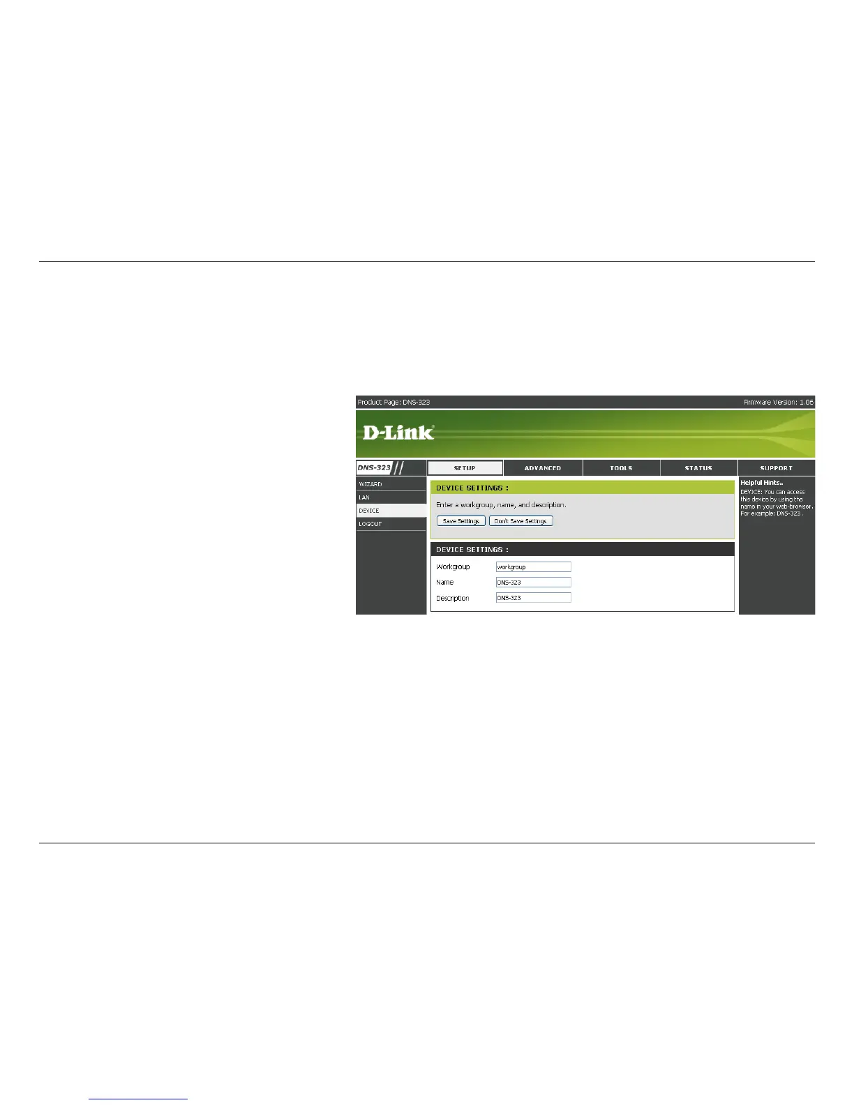 The device settings page allows you to assign a workgroup, name and description to the DNS-323.