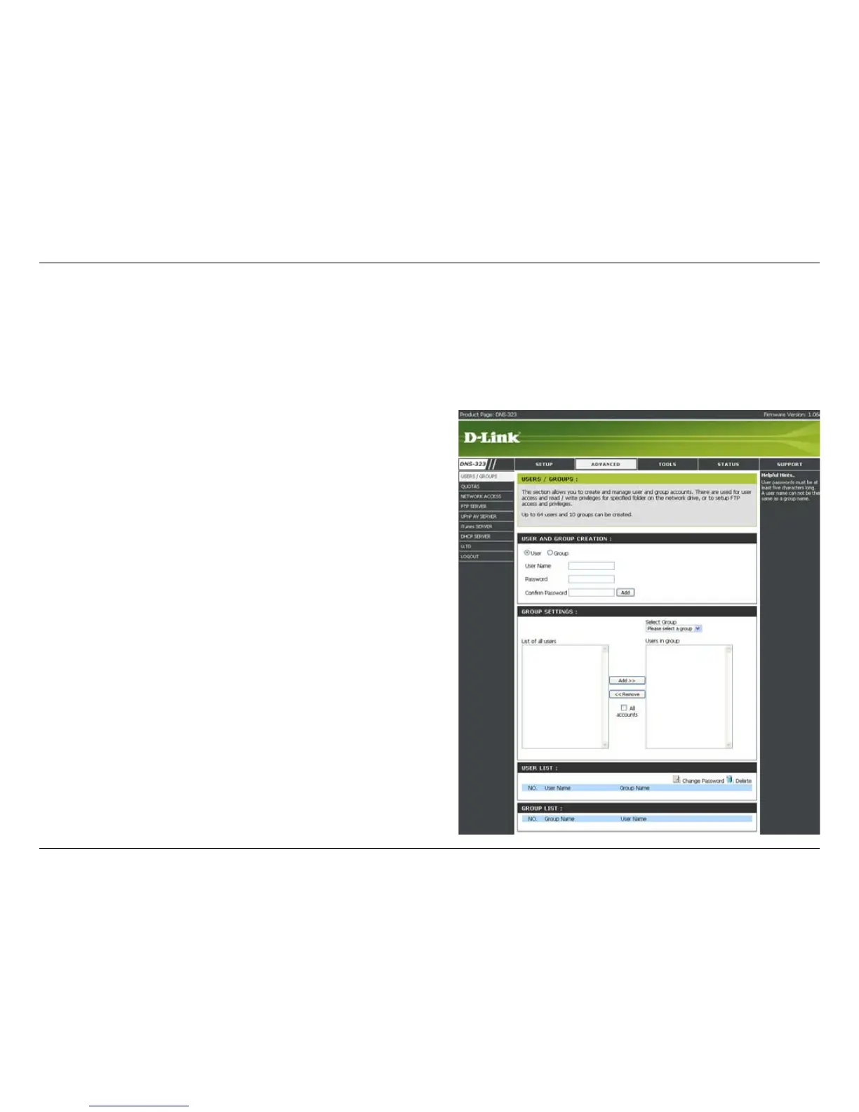 The DNS-323 supports up to 64 unique users. The users can be added to a group, or individually. The users and groups