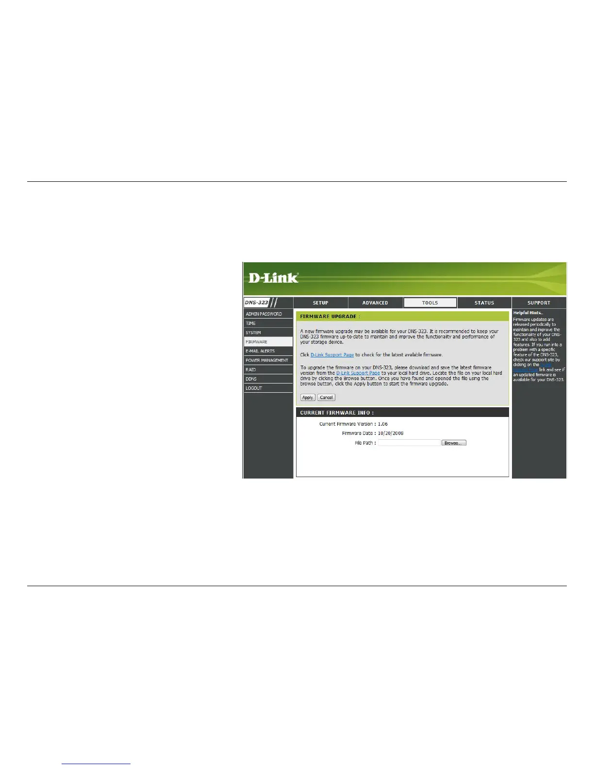 The DNS-323 Firmware menu makes it simple to check for new firmware releases and upload them to the device.