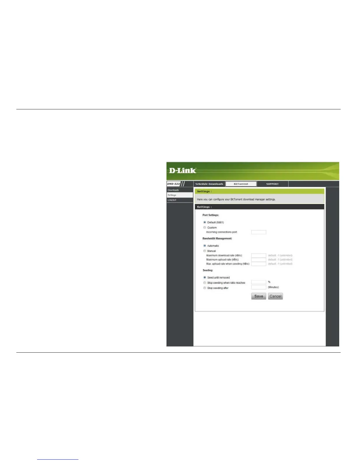 You can use the radio buttons on this screen to customize the Bit Torrent Settings of the DNS-323.