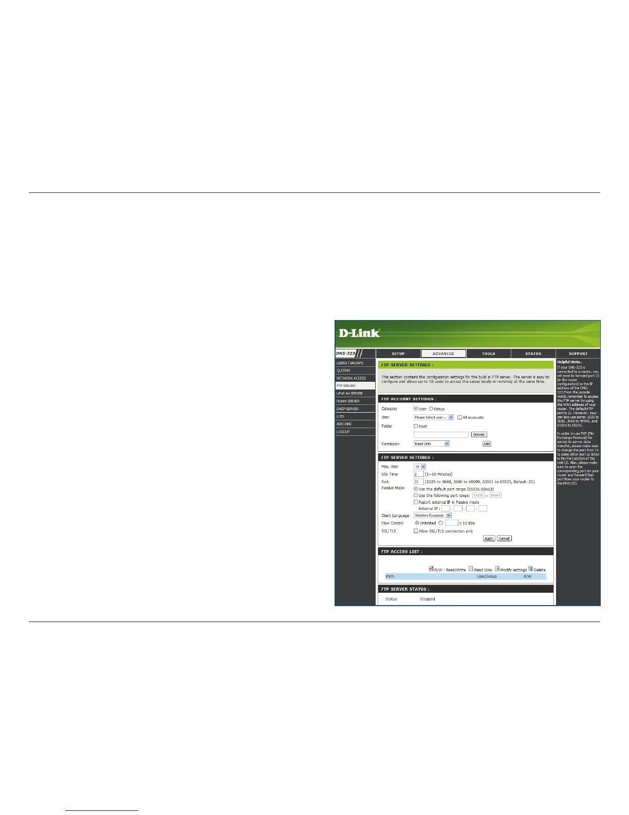 The DNS-323 is equipped with a built-in FTP Server, which is easy to congure. It allows users access to important