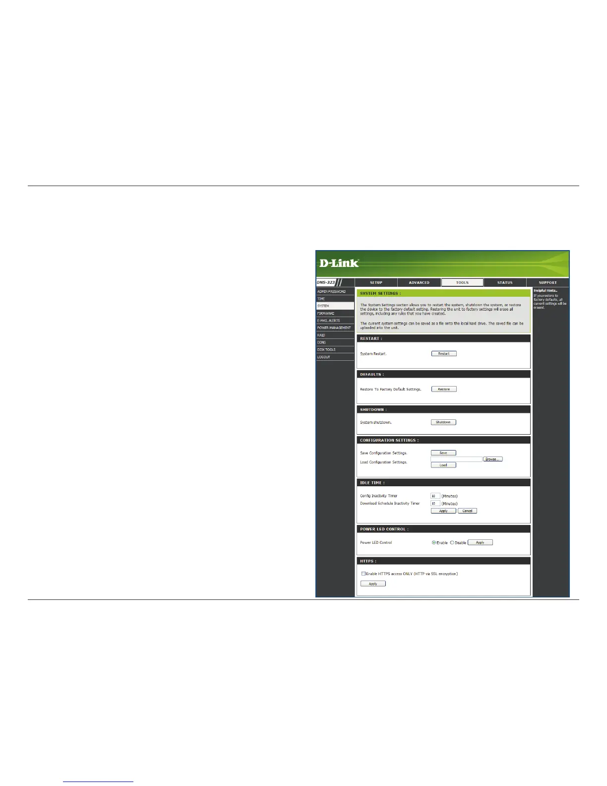 The DNS-323 System menu provides options for system restarts, saving and loading conguration settings, and setting