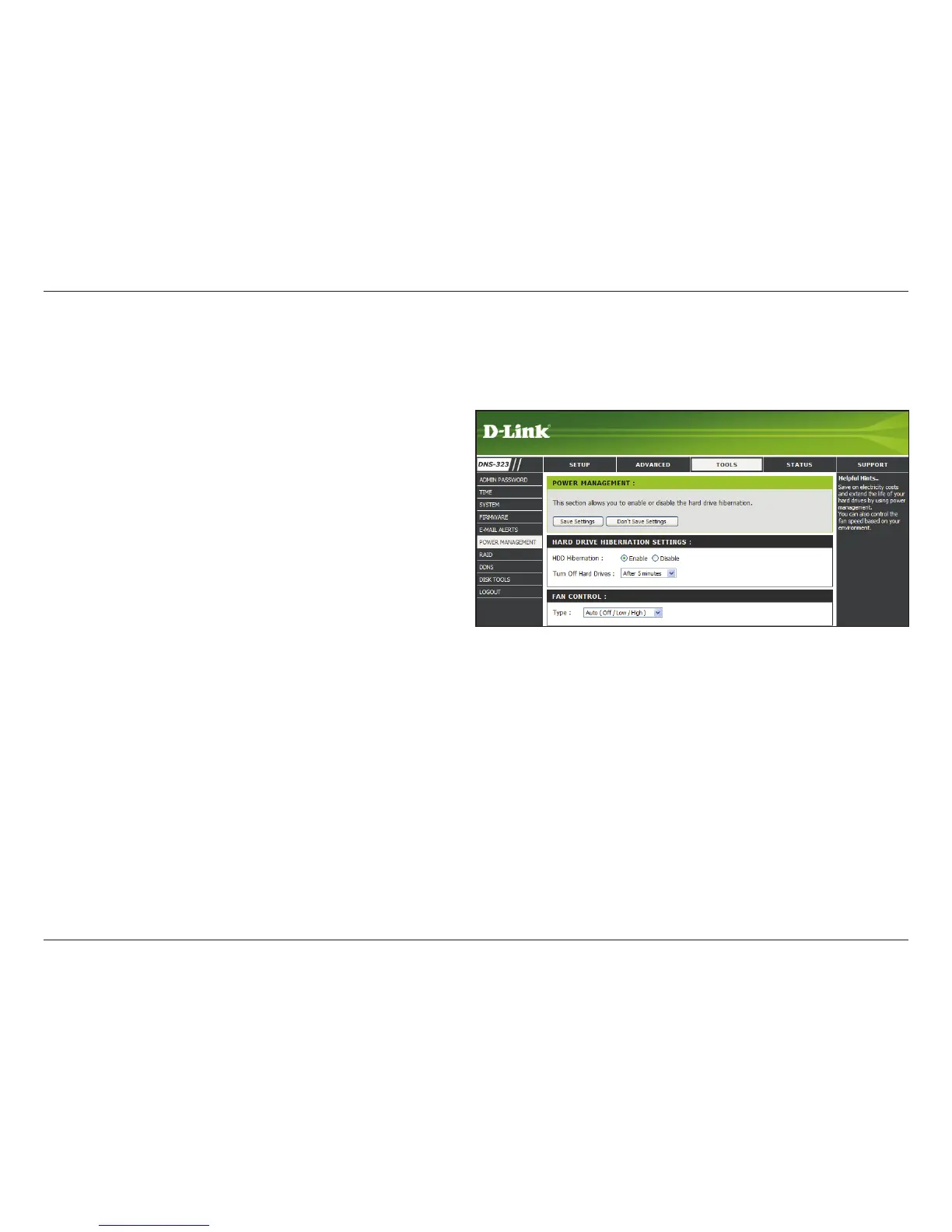 The DNS-323 Power Management feature allows you to congure the drives to shut down while power remains constant