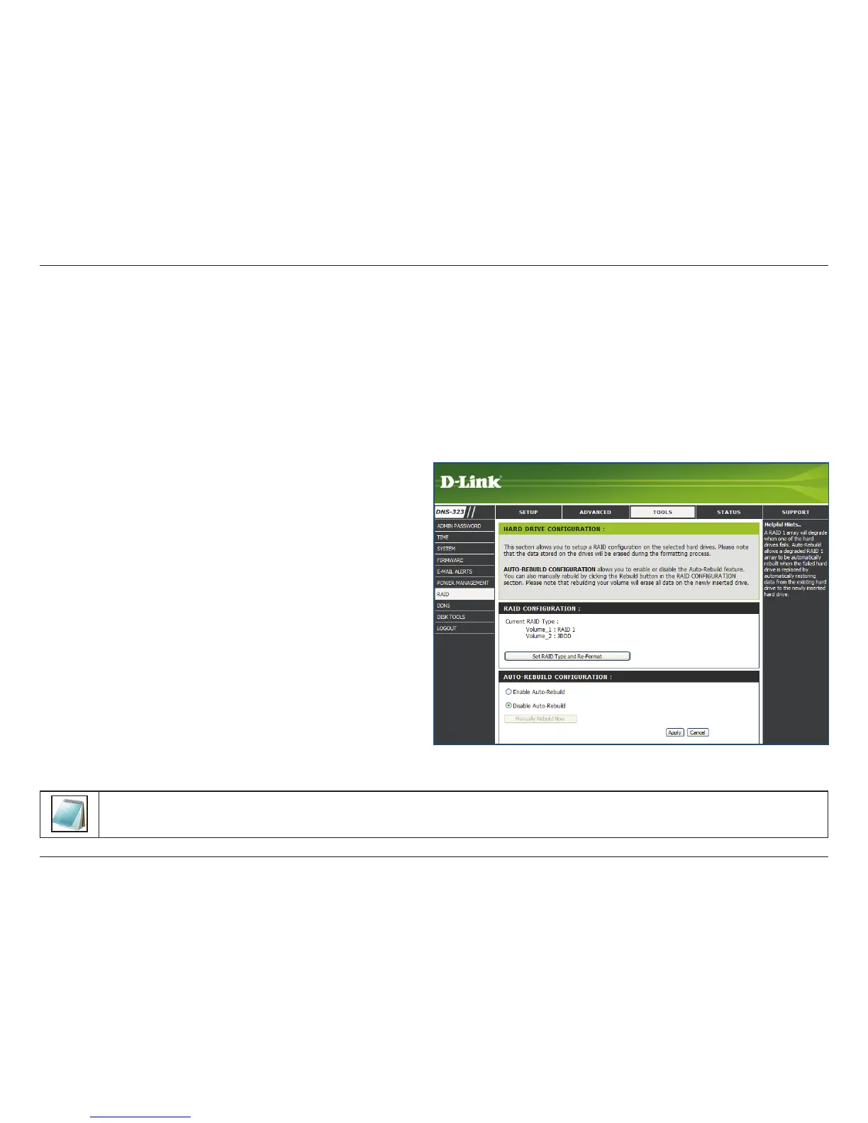When RAID 1 is used, the DNS-323 supports both Auto Rebuild and Manual Rebuild. Auto Rebuild allows a degraded