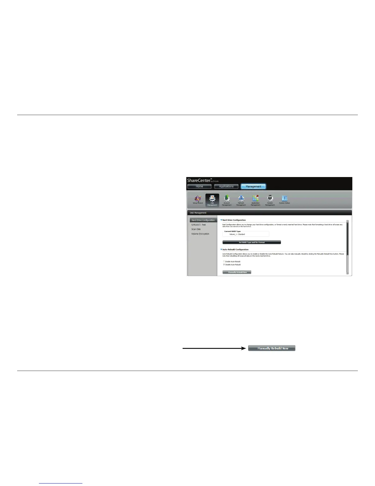 To setup the Hard Drive RAID conguration of your ShareCenter™, click on the Management tab and then the Disk Management icon. Select the