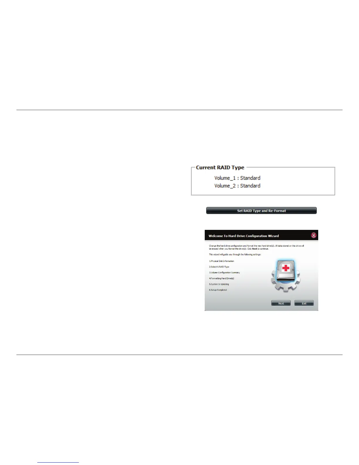 When you click on the Set RAID type and Re-Format button in the Disk Management-Hard Drive Conguration menu a wizard will start, allowing