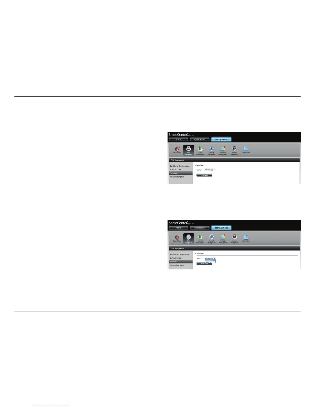 Scan Disk provides a method to test the disk’s le system on your ShareCenter. Scan Disk scans your disks le system for errors and/or