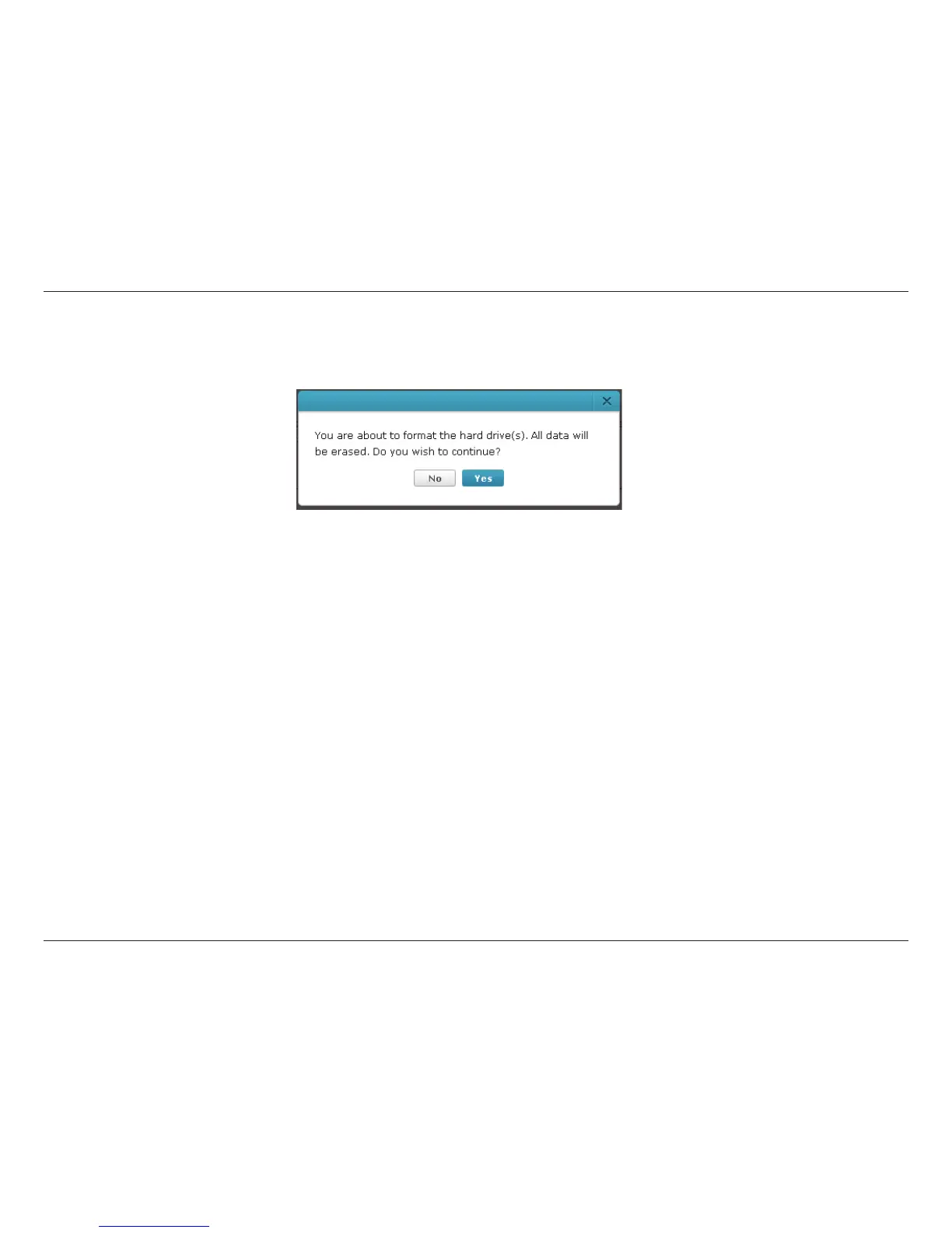 message appears asking you to conrm your choice to format the volume using mydlink. Click Yes to format, No to return to the menu.