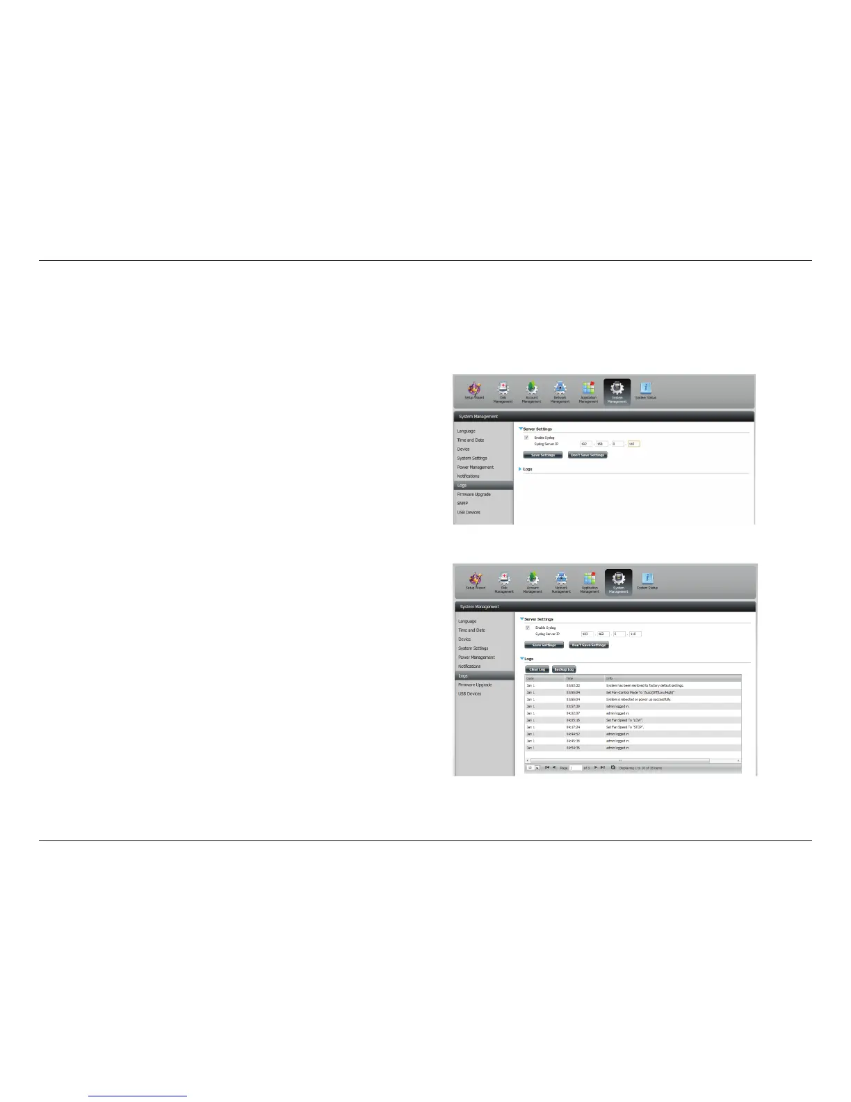 Within the Logs menu you can setup your ShareCenter™ to send the ShareCenter’s™ log events to the SysLog server. You can also view the NAS