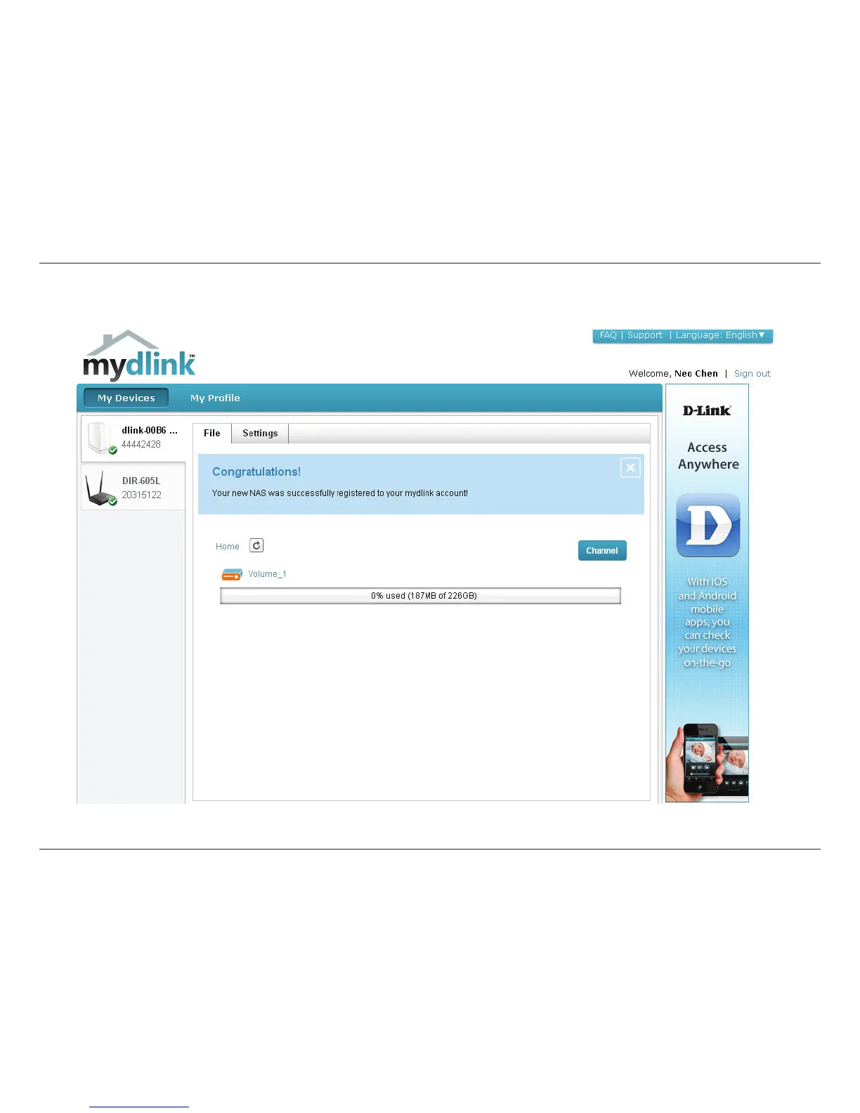 Once the format process is complete, mydlink cloud will show you the RAID status and the Volume Status. It also displays the size of the drive