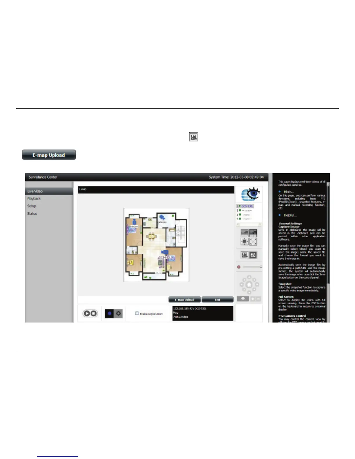 You can access the E-map from the Live Video screen by clicking the button. Note: you must have installed e-map JPEG les
