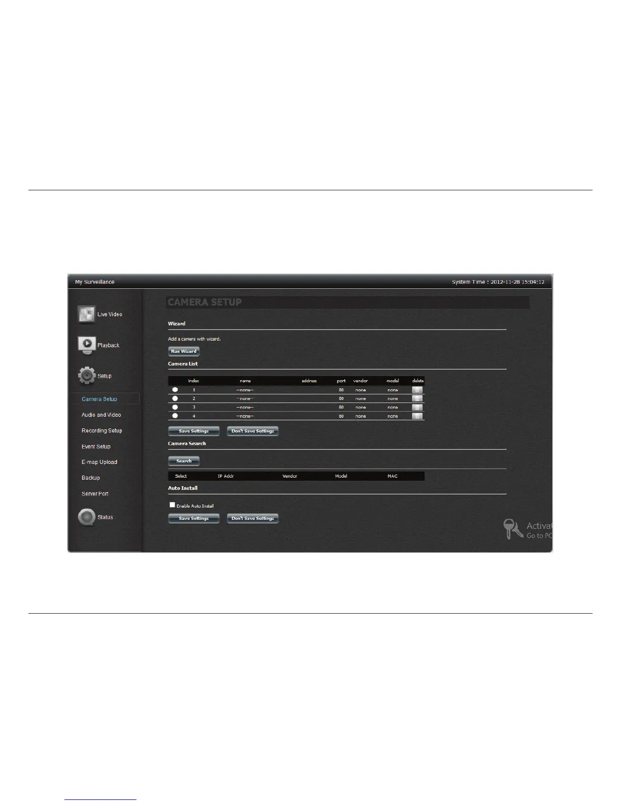 options. Camera Setup is divided into four sections. Wizard, Camera List, Camera Search, and Auto Install. Let’s take a look at Wizard rst.