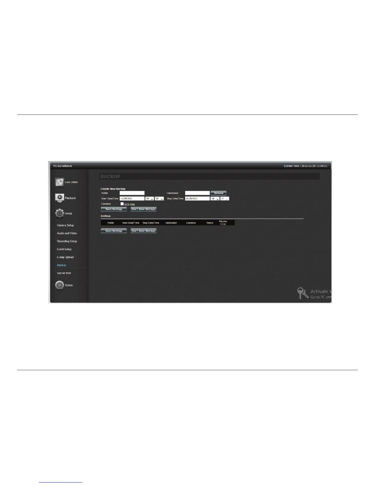 The Backup Setup page allows you to congure the ShareCenter NAS to backup and restore the IP Camera recordings.