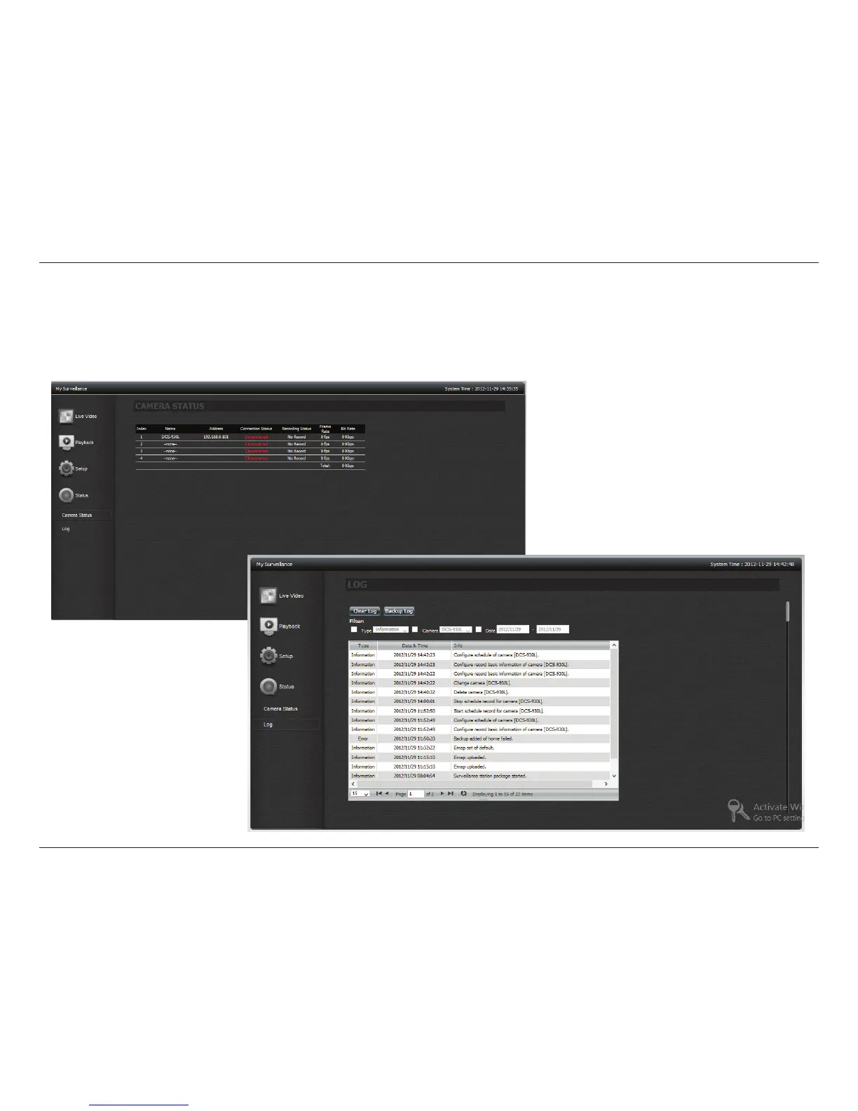cameras connected to the network, and Log shows a history of all signicant events of the Surveillance Center software. You can lter the events