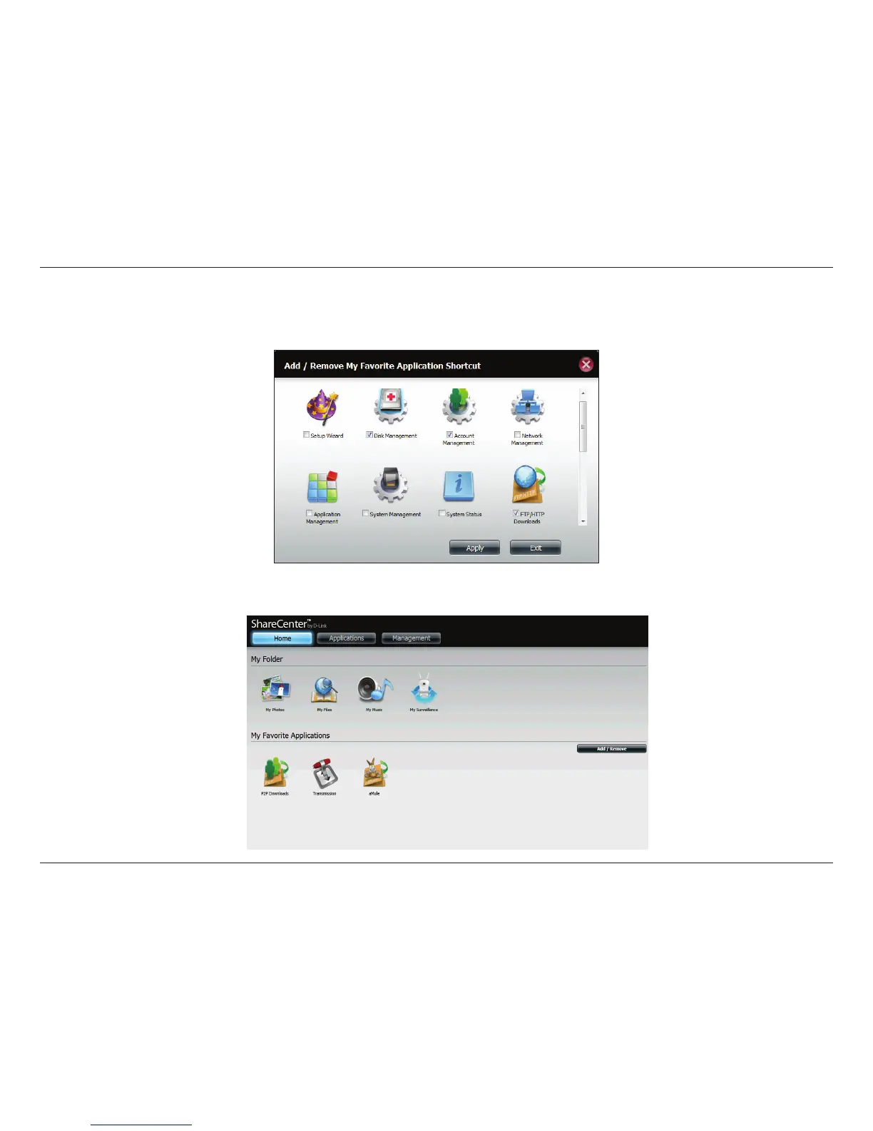 Click the Add/Remove button to add Applications. Click the checkbox under each application you wish to add to the Home screen. Click Apply