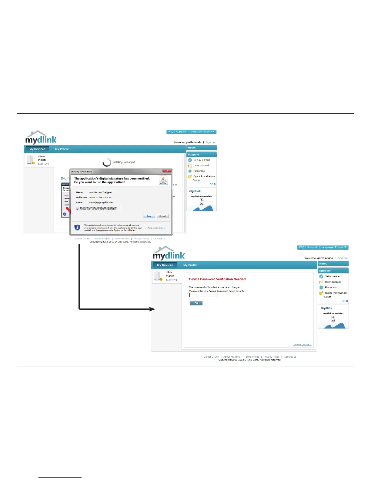 After the Java Runtime machine is installed, run the mydlink application and enter the password.