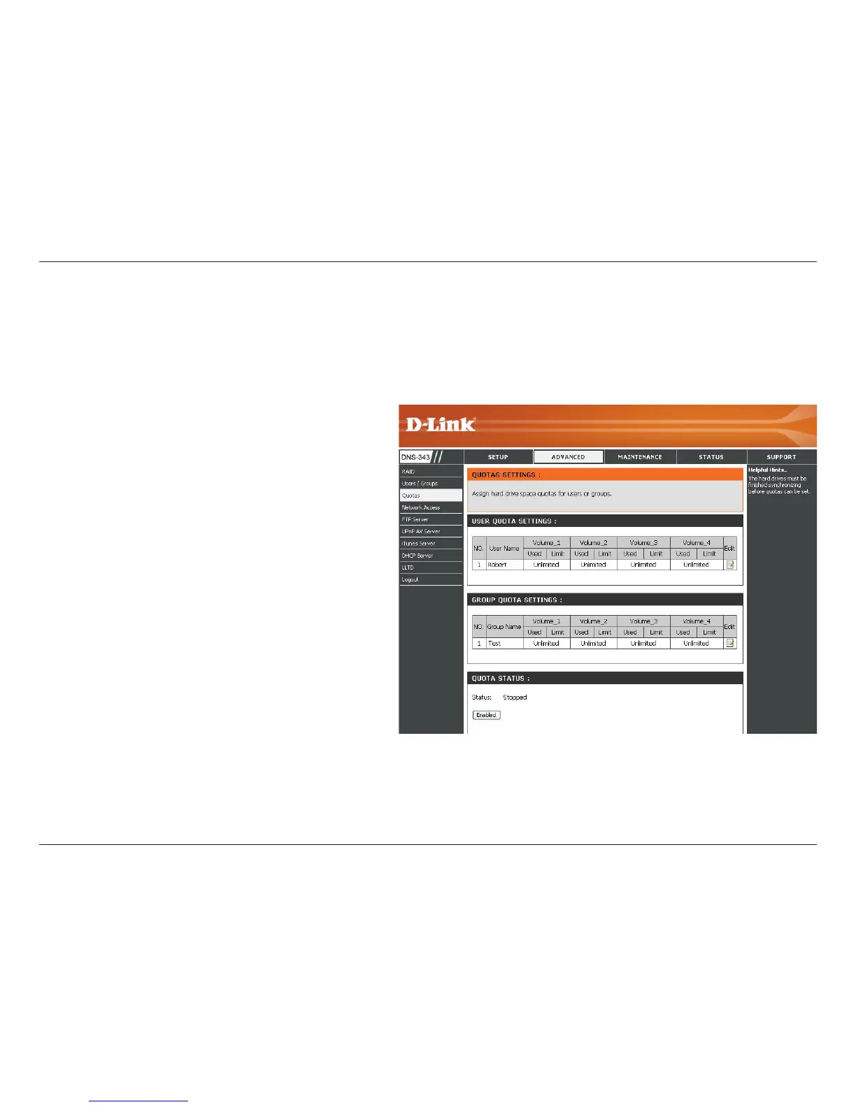 The DNS-343 supports storage quotas for both groups and individual users. Assigning a quota to a group or user will