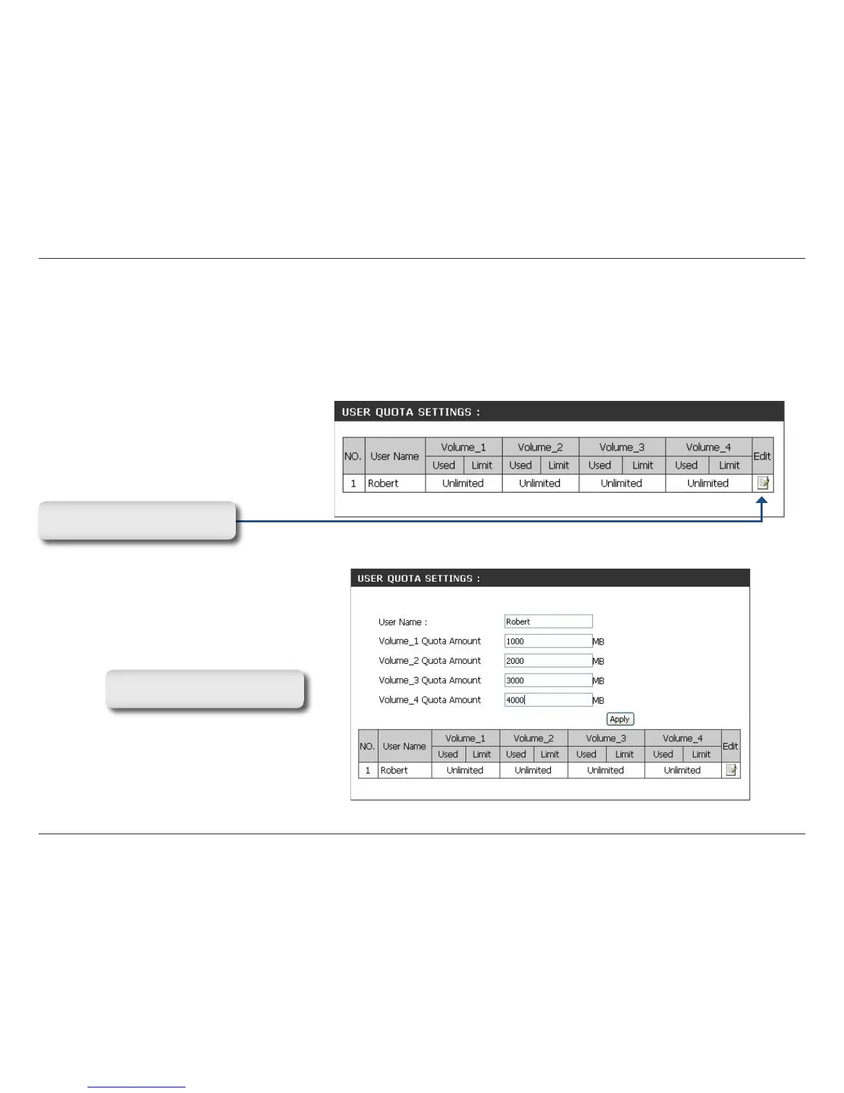 All users and groups are automatically listed on this page, and cannot be deleted. The default quota setting is