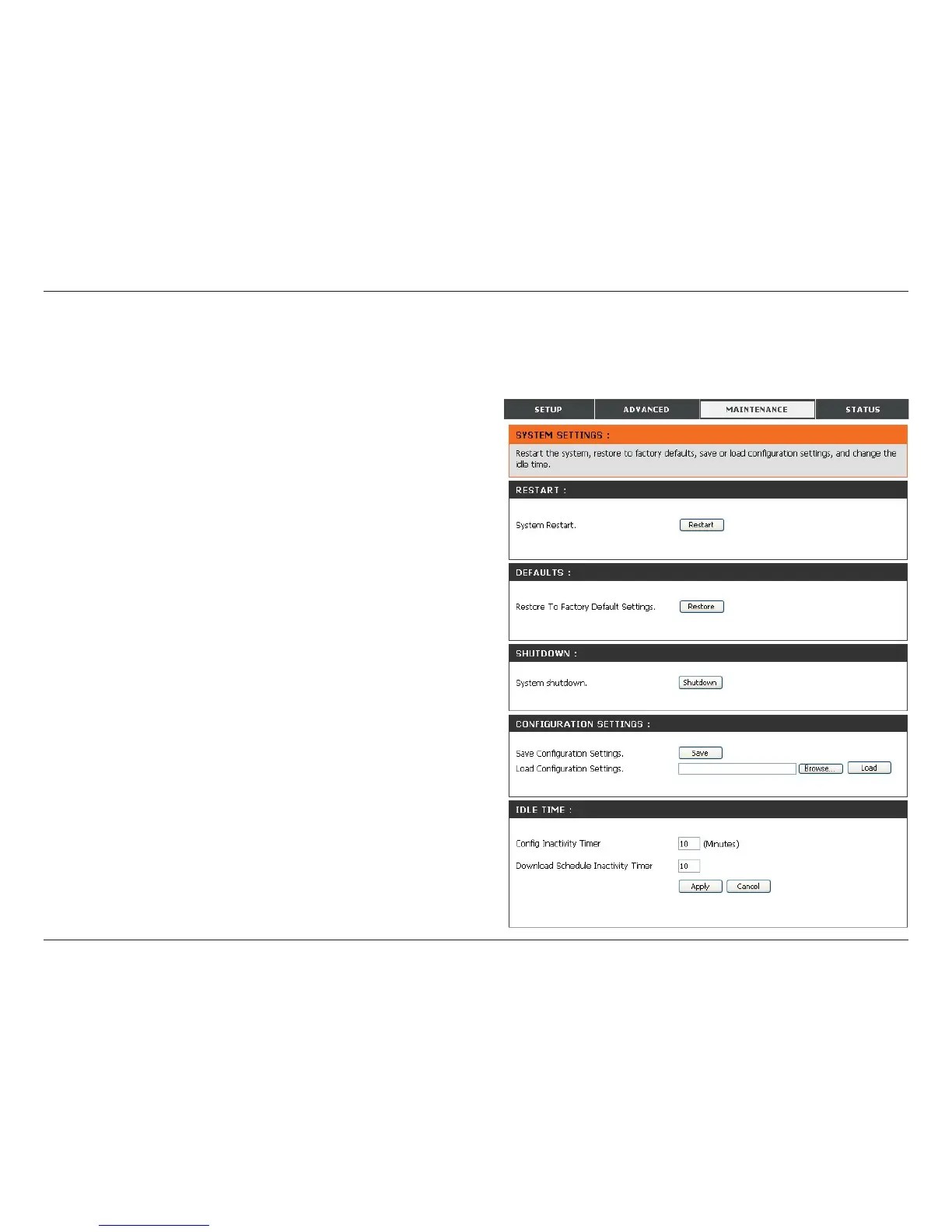 The DNS-343 System menu provides options to perform a system restart, save and load configuration settings, and