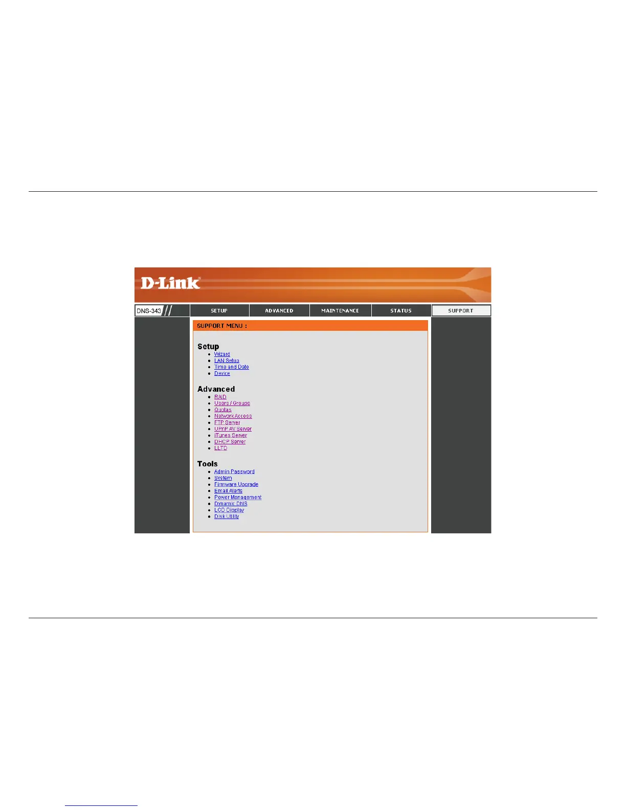 The DNS-343 Support page provides a menu of Support topics explaining the features of the device.